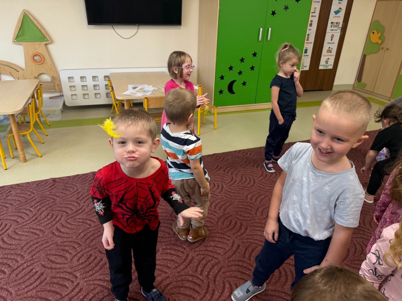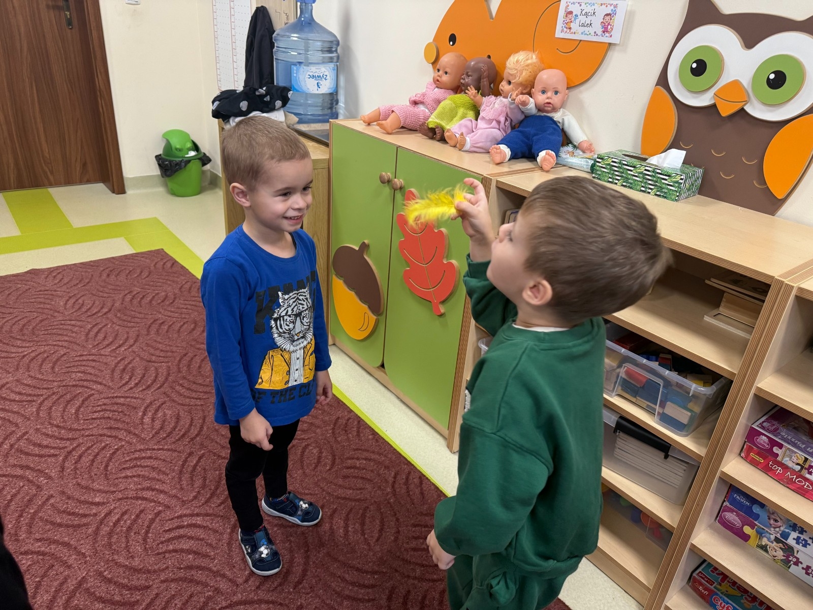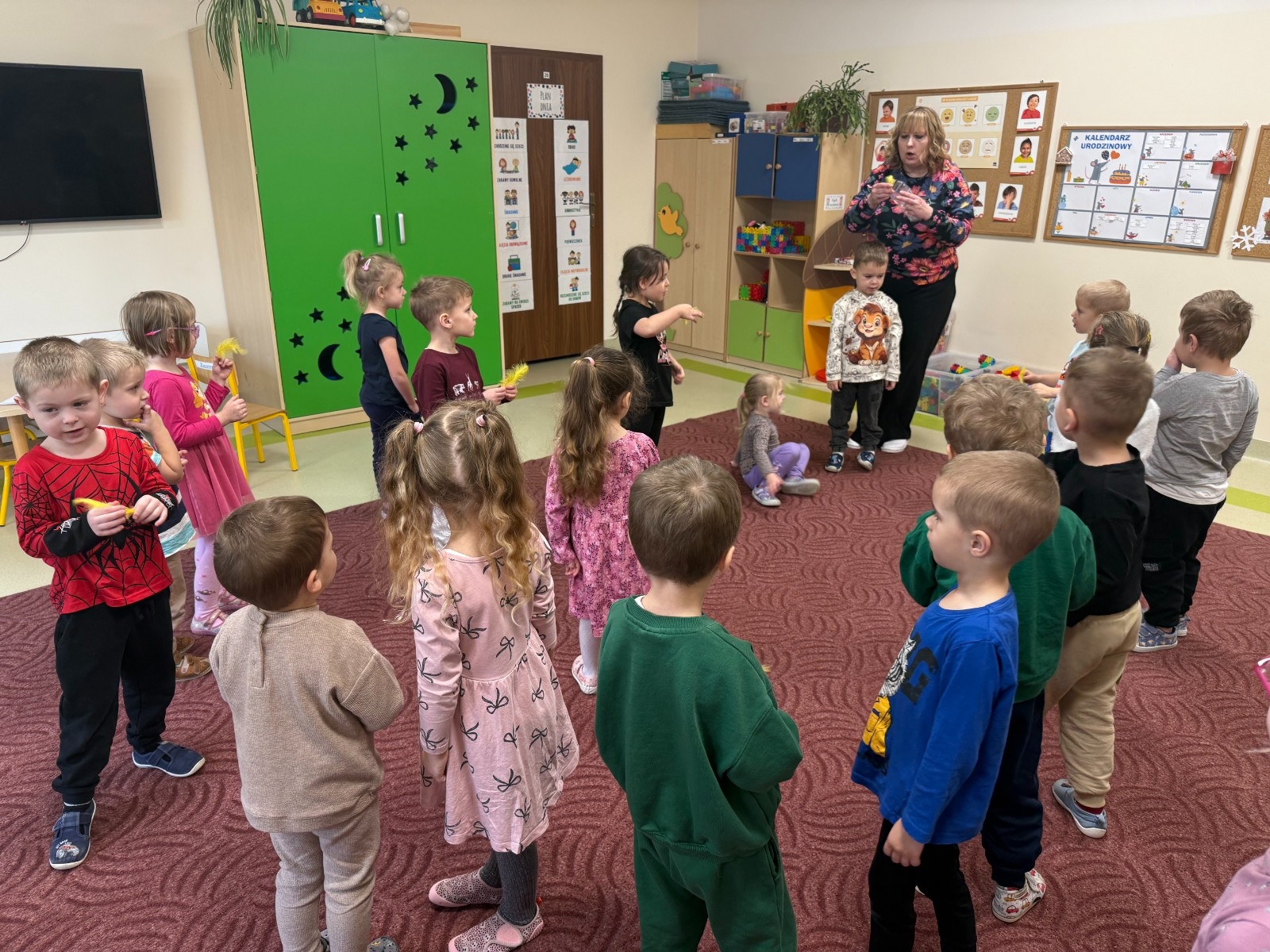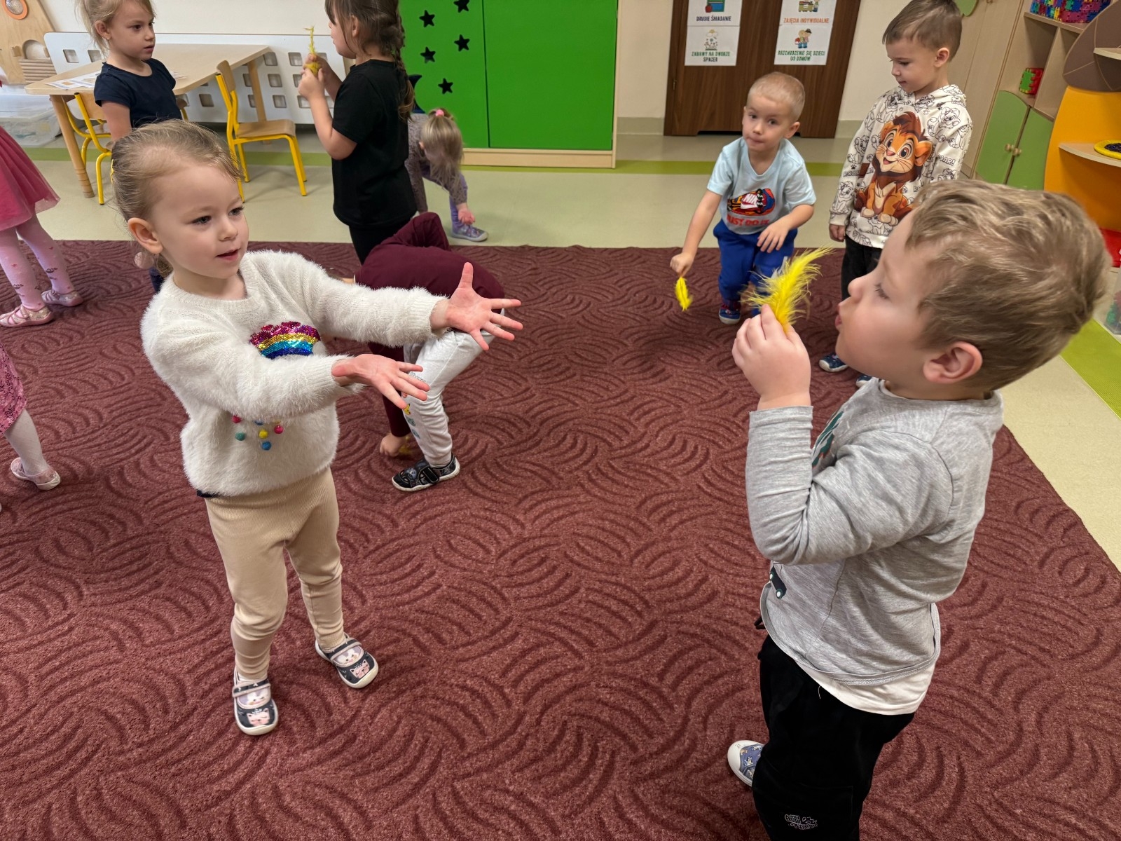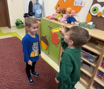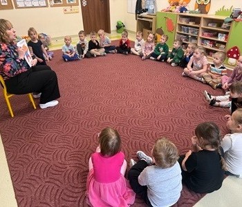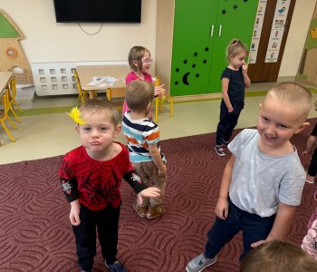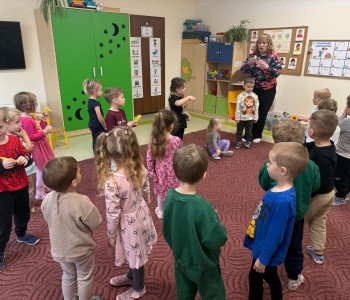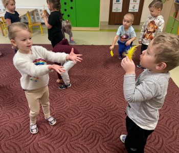 Najmłodsi dobrze się bawili naśladując odgłosy zwierząt i dmuchając na piórka, a przy okazji poprawiali kondycję aparatu artykulacyjnego. Dziękujemy Pani Agnieszce za spotkanie.