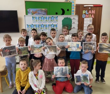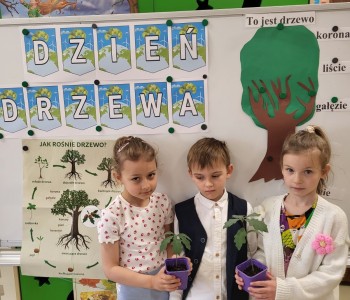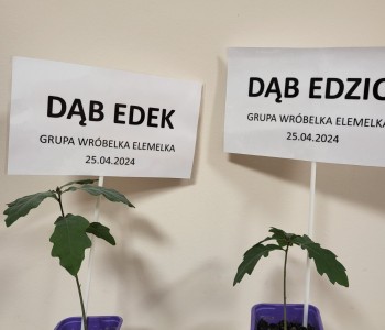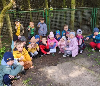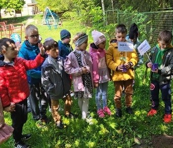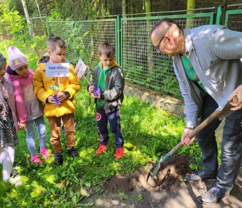 W czasie zabaw badawczych w ogrodzie przedszkolnym dzieci oglądały drzewa, dotykały kory, liści i kwiatów. Na zakończenie dzieci posadziły w ogrodzie przedszkolnym dwa dęby (Edka i Edzia), które wyhodowały w grupie z żołędzia. Sadzonka pięknie rosła czekając na dzisiejszy dzień. Święto Drzewa to doskonała okazja aby kształtować postawę ekologiczną wśród najmłodszych dzieci.
