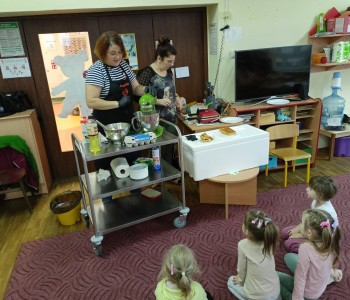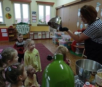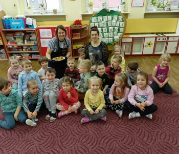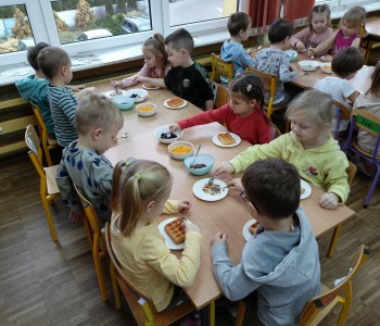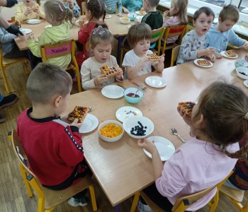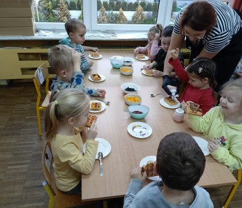 Małe dzieci lubią wszystko brać do rąk i wkładać każdy przedmiot do ust. Ta chęć smakowania oznacza, że maluch z pewnością prawidłowo rozwija swój zmysł smaku i dotyku. Już w tym okresie wprowadzamy dzieciom zabawy kulinarne. Właśnie w taki kulinarny świat wprowadziła grupę Misia Uszatka Pani Angelika Strzebińska, która przygotowała gofry. Dzieci natomiast miały możliwość udekorowania ich według własnego smaku. Przyjemność wynikająca ze wspólnego doświadczania smaków, zapachów i barw sprawia bowiem niezaprzeczalną radość dostępną na wyciągnięcie ręki.