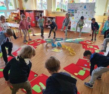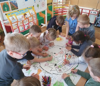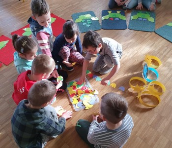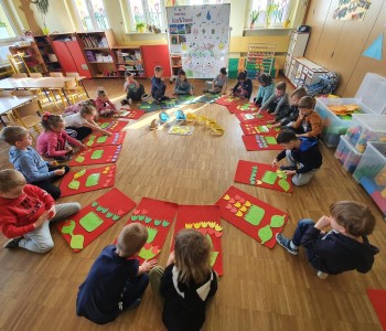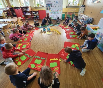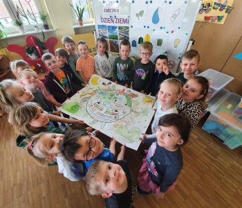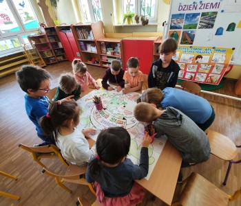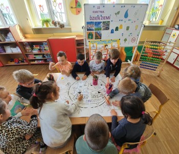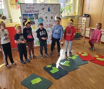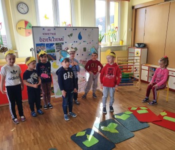 Przygotowana w grupie inscenizacja pt. Dzień Ziemi uświadomiła dzieciom, jak ważna jest przyroda i troska o naszą planetę. Dzieci wykonały również plakat ekologiczny, dyskutowały o tym jakie działania możemy podejmować, aby chronić środowisko. Doskonaliliśmy również umiejętności matematyczne licząc i dodając z wykorzystaniem sylwet wiosennych kwiatów. Podsumowaniem naszych działań było ślubowanie przyjaciela przyrody, zobowiązujące do dbania o rośliny, zwierzęta i czystość w otoczeniu.