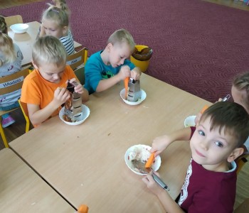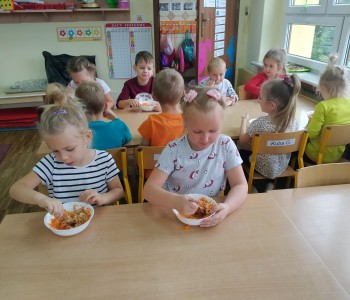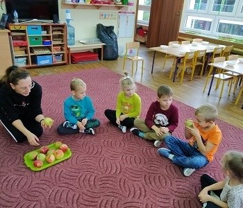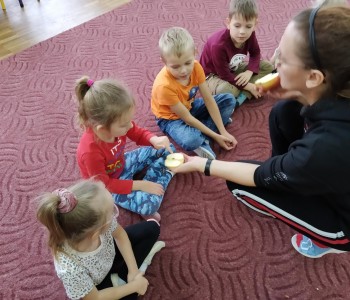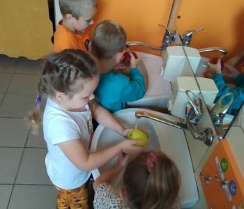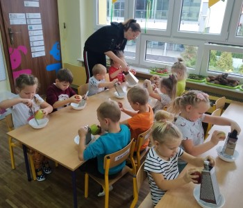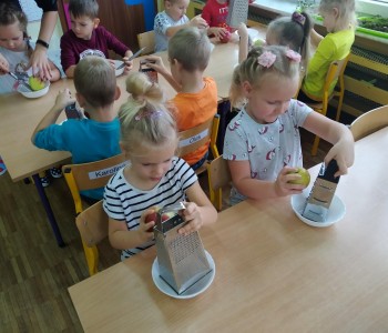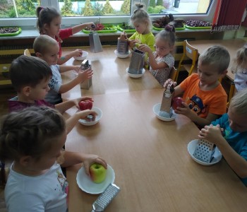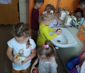 Dzień Jabłka w grupie rozpoczęliśmy od rozmów na temat jego wyglądu, koloru, wielkości, kształtu i smaku. Utrwaliliśmy wiedzę na temat cyklu wzrostu jabłka, poznaliśmy jego budowę. Przedszkolaki dowiedziały się ,że bardzo ważne jest to, żeby jabłka jeść ze skórką. Należy tylko pamiętać aby przed spożyciem dokładnie je umyć. Pod koniec zajęć dzieci wzięły udział w warsztacie kulinarnym i przygotowały zdrowy deser.