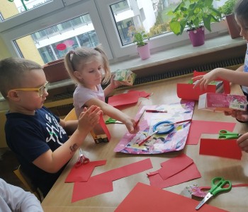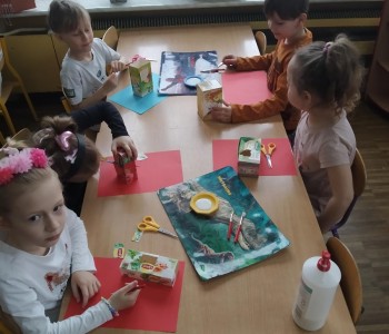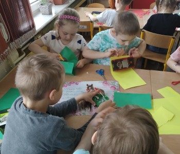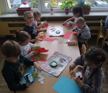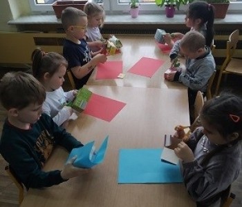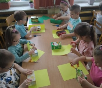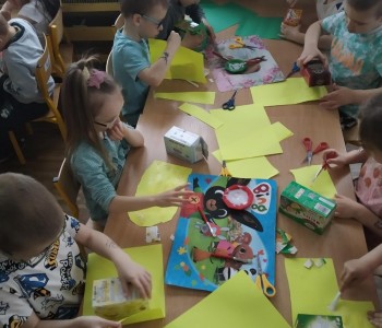 A podczas zajęć technicznych wykorzystały papierowe kartoniki do stworzenia „Pożeracza śmieci”, który uwaga zjada tylko adekwatne do koloru śmieci. Przygotowują prace dzieci ćwiczyły umiejętność planowania pracy, prawidłowego posługiwania się nożyczkami oraz precyzję ruchów. „Pożeracze śmieci” ozdobiły hol przedszkola, aby przypominać wszystkim, jak istotne jest segregowanie odpadów.
