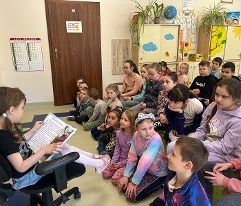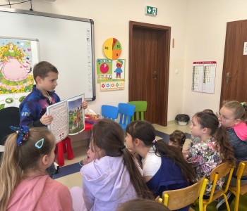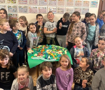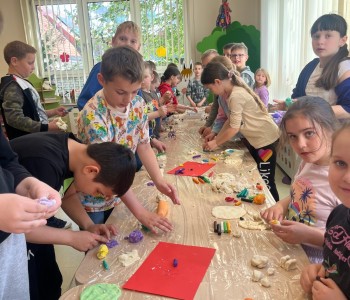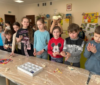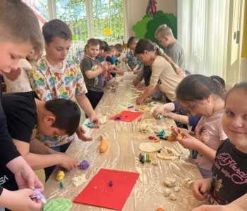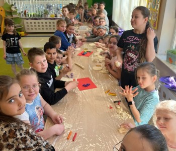 W ramach współpracy przedszkola z Szkołą Podstawową, przedszkolaki zaprosiły kl. III na warsztaty plastyczne. Spotkanie rozpoczęło się od przeczytania przez dzieci, opowiadania „Wiosenna Łąka”. Przedszkolaki wspólnie z uczniami rozmawiali na podstawie utworu, ilustracji na temat wiosennej łąki. Następnie wykonali makietę „Majowa łąka” z masy solnej oraz plasteliny.