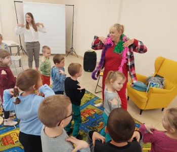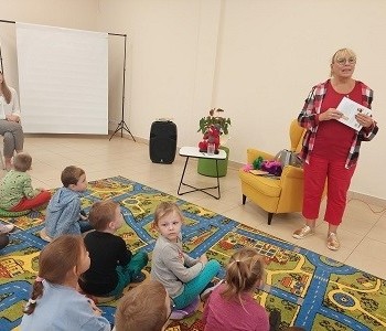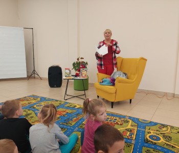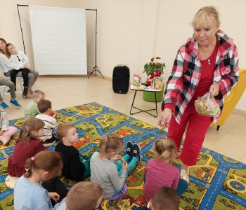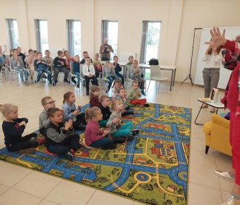 Ewa Chotomska to reżyserka i scenarzystka programów edukacyjnych dla dzieci, takich jak: „Budzik” , „Domowe przedszkole” i „Jedyneczka”, a także autorką książek i tekstów piosenek dla dzieci m.in. „Mydło lubi zabawę” czy „Moja fantazja”, które chętnie zaprezentowała podczas spotkania. Opowieści pani Ewy przeplatane były piosenkami, wierszykami, rymowankami, zagadkami i zabawami ruchowymi. Uśmiechnięte buzie dzieci i pełne pozytywnych emocji reakcje świadczyły o bardzo udanym spotkaniu.