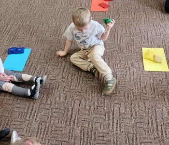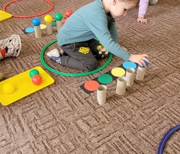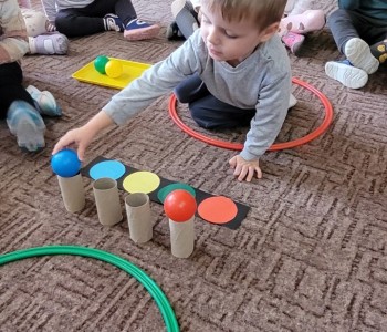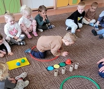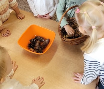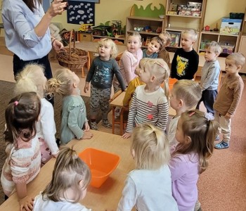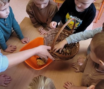 Dzieci z grupy Smerfów na zajęciach utrwalały między innymi nazwy darów jesieni. Sprawdzały, które z nich toną, a które pływają. Podczas zajęć nie zabrakło nazywania podstawowych kolorów oraz przeliczania w dostępnym zakresie. Maluszki ćwiczyły jednocześnie sprawność ruchową i manualną.
