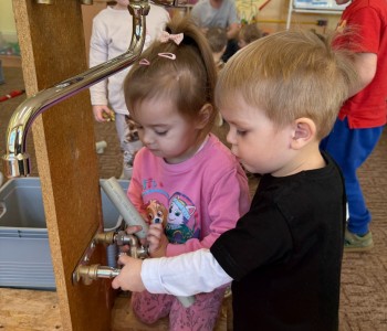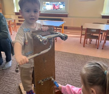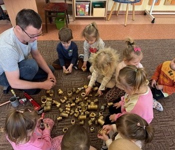 Z wielką radością próbowały poskręcać rury. Na zakończenie dzieci otrzymały od panów kolorowanki i słodki poczęstunek, a same podziękowały za wizytę wręczając laurkę i czekoladki. To była bardzo miła wizyta. Dziękujemy za przybycie.