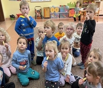 Przedszkolaki dmuchały na różnokolorowe paski krepy i piórka, bawiły się z chrupkami, a to wszystko w celu usprawniania narządu mowy. Na zajęciach było, kolorowo, wesoło, a także smacznie:-)