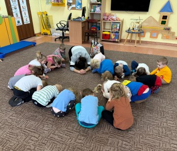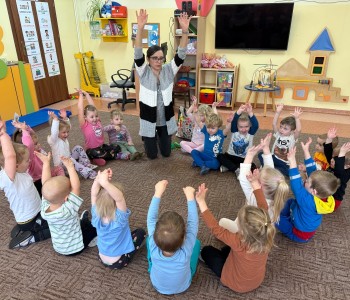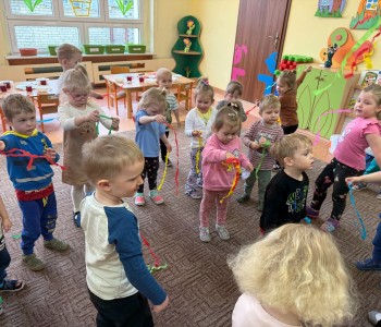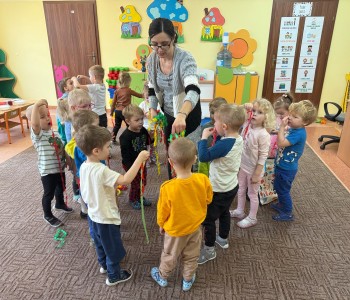 Pod koniec marca w grupie "Smerfy" odbyły się kolejne, grupowe zajęcia logopedyczne. Podczas wspólnych zabaw najmłodsi wykonywali ćwiczenia oddechowe, słuchali wiosennego opowiadania ilustrując ruchem jego treść.