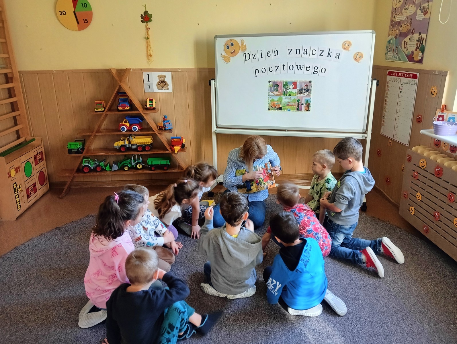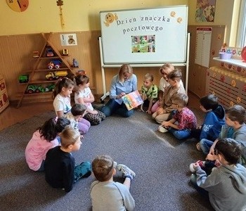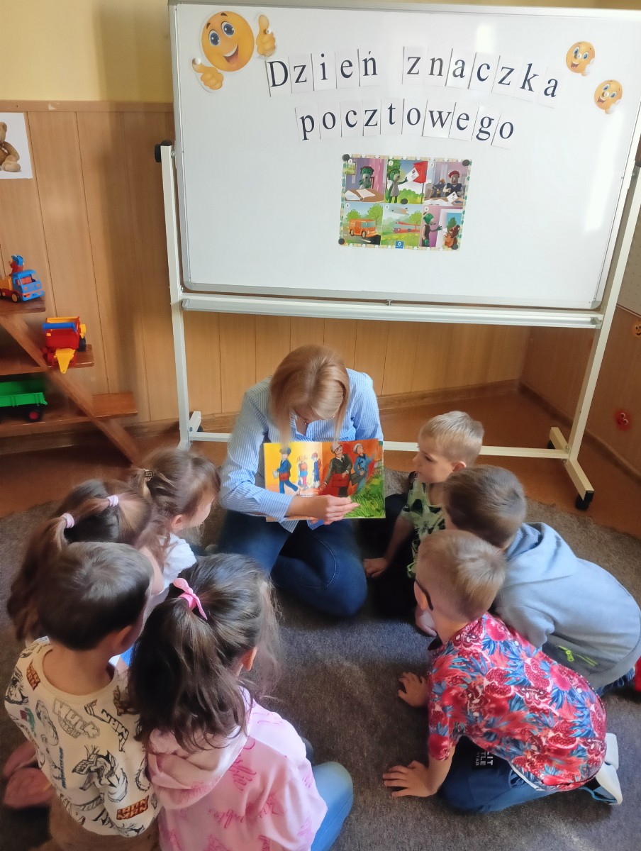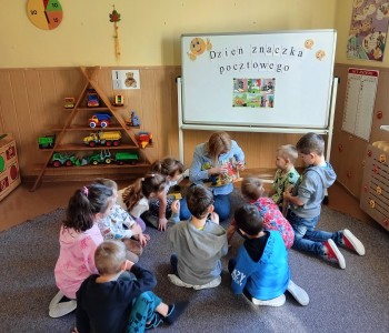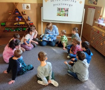 Podczas spotkania z okazji „Dnia Znaczka Pocztowego” przedszkolaki z grupy „Myszka Miki” wysłuchały w skupieniu książeczkę pt.: „Listonosz” dzięki której zapoznały się z pracą listonosza dostarczającego ludziom listy, kartki pocztowe oraz przesyłki wyposażone w znaczki pocztowe.