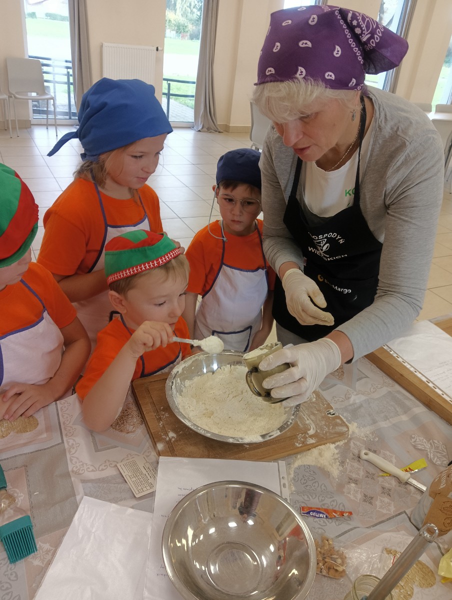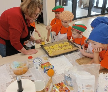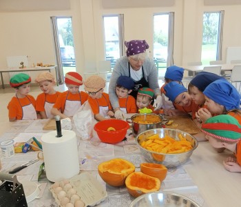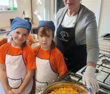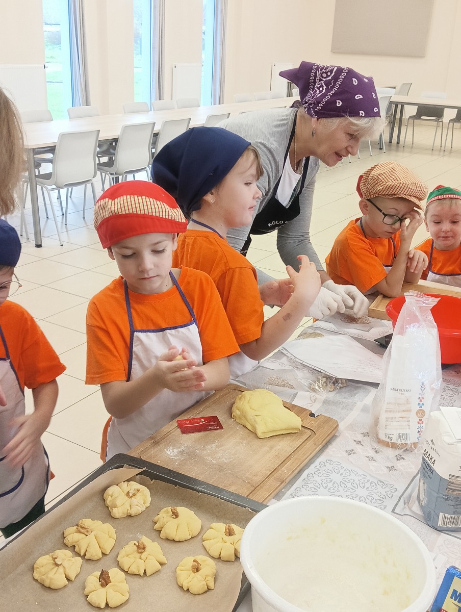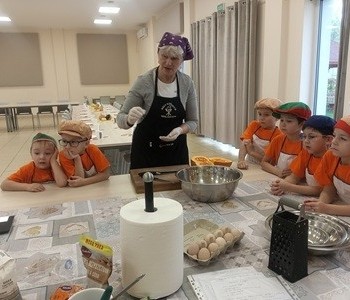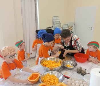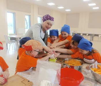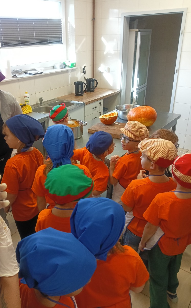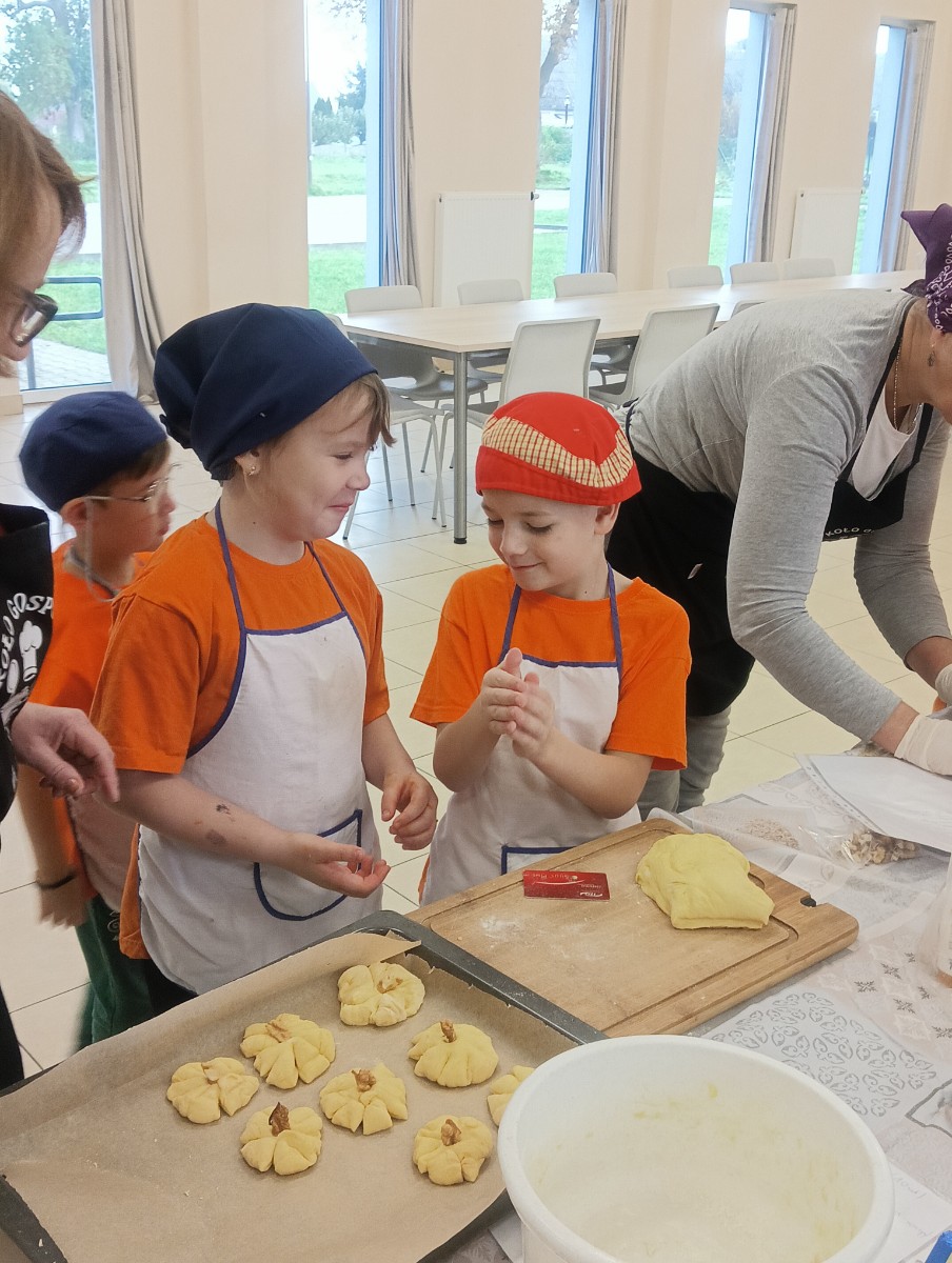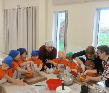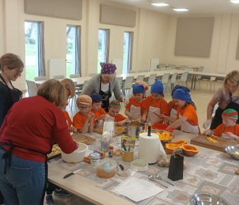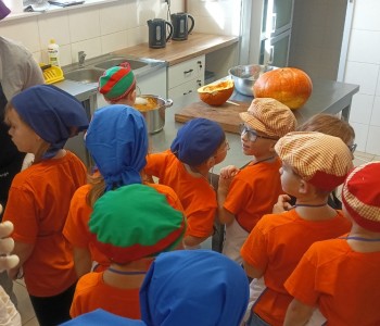 Dzieci wysłuchały porad i zabrały się do pracy, pomagając przy obróbce warzywa. Pierwsze zadanie polegało na wydrążeniu dyni, wyciągnięciu z niej pestek i zbędnego miąższu. W międzyczasie należało przygotować stanowisko do pracy. Następnie przeszliśmy do ostrożnego krojenia, ścierania dyni na tarce, odmierzania i dodawania innych niezbędnych składników. Kiedy powstały przysmaki, przystąpiliśmy do degustacji owoców naszej pracy. Spotkanie miało na celu nie tylko poznanie ciekawostek kulinarnych i nowych smaków. Dzięki użyciu dyni stało się ono zarazem świetnym ćwiczeniem sensorycznym, dlatego że jej obróbka wymaga więcej uwagi i posiada ona różne rodzaje faktury, a także różnorodną konsystencję. Dowiedzieliśmy się jak bardzo uniwersalne jest to sezonowe, jesienne warzywo i co można z niego przyrządzić. Co więcej, był to kolejny krok do nauki samodzielności i zaradności. Domowa atmosfera sprawiła, że zajęcia stały się przyjemnością i odskocznią od nauki w tradycyjnym rozumieniu. Bardzo dziękujemy Paniom z Koła Gospodyń Wiejskich, które poświęciły nam czas oraz podzieliły się swoją cenną wiedzą. Mamy nadzieję, że uda się nam podtrzymać współpracę i będzie nam dane wziąć udział w większej ilości ciekawych spotkań.