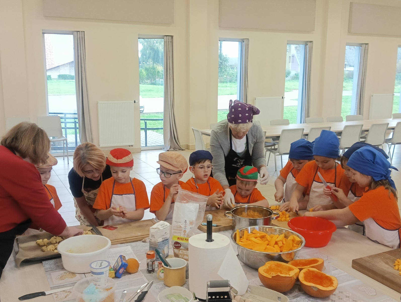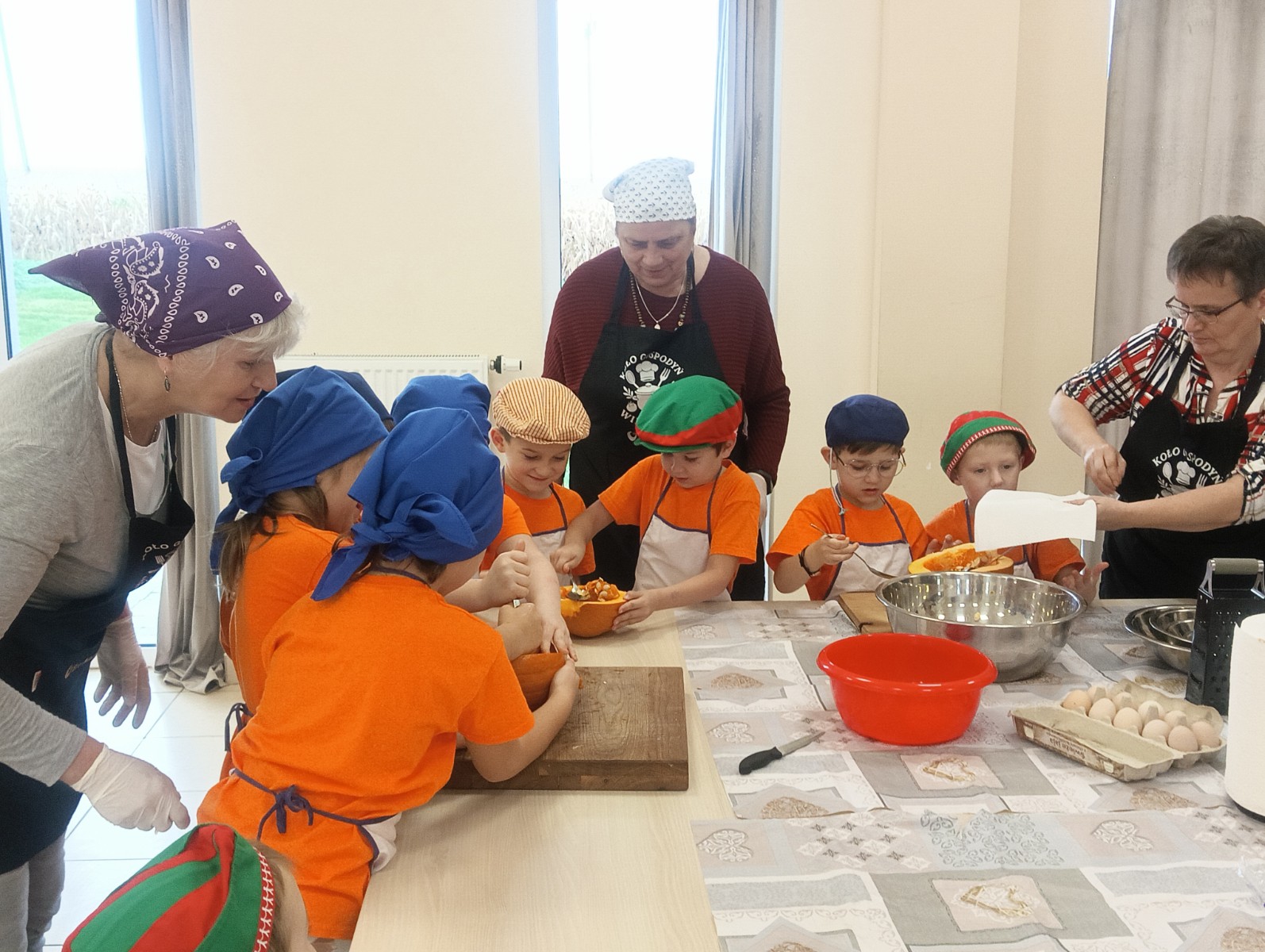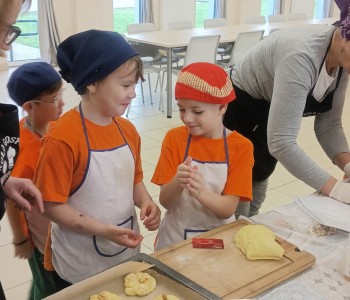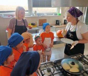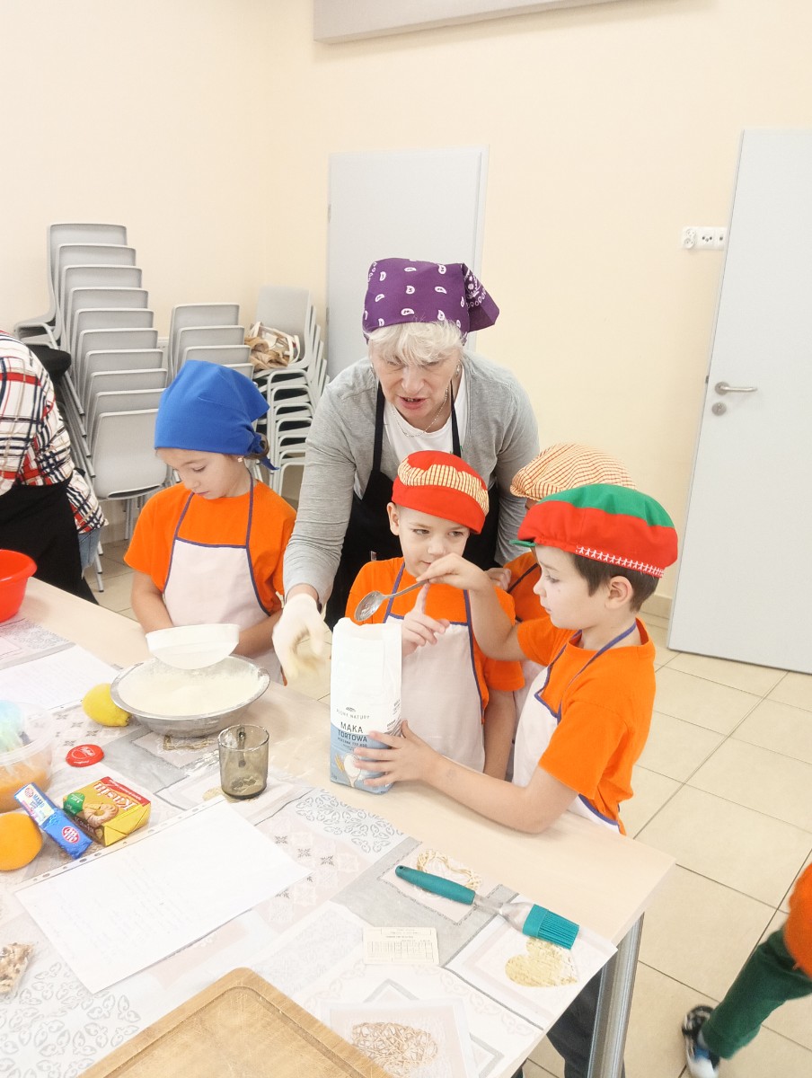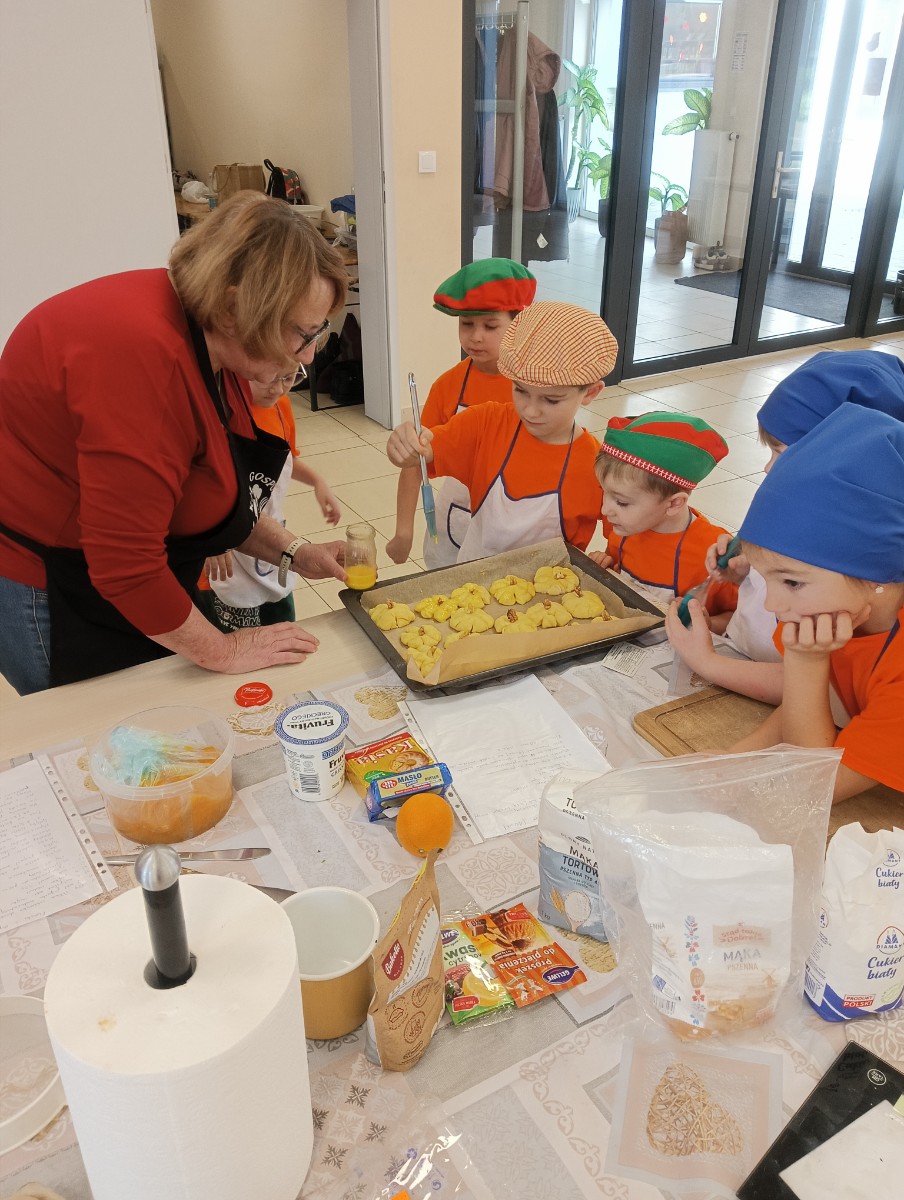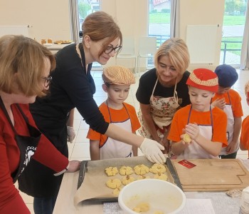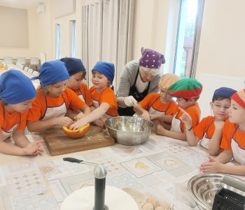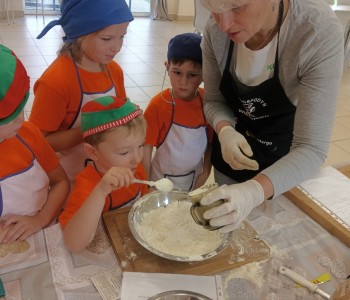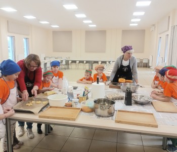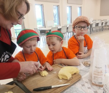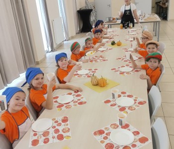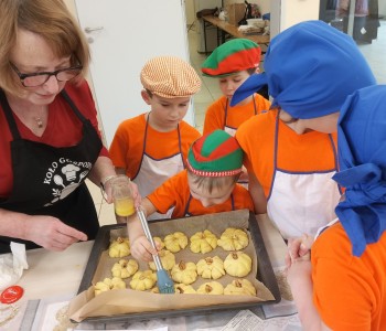 Dzieci wysłuchały porad i zabrały się do pracy, pomagając przy obróbce warzywa. Pierwsze zadanie polegało na wydrążeniu dyni, wyciągnięciu z niej pestek i zbędnego miąższu. W międzyczasie należało przygotować stanowisko do pracy. Następnie przeszliśmy do ostrożnego krojenia, ścierania dyni na tarce, odmierzania i dodawania innych niezbędnych składników. Kiedy powstały przysmaki, przystąpiliśmy do degustacji owoców naszej pracy. Spotkanie miało na celu nie tylko poznanie ciekawostek kulinarnych i nowych smaków. Dzięki użyciu dyni stało się ono zarazem świetnym ćwiczeniem sensorycznym, dlatego że jej obróbka wymaga więcej uwagi i posiada ona różne rodzaje faktury, a także różnorodną konsystencję. Dowiedzieliśmy się jak bardzo uniwersalne jest to sezonowe, jesienne warzywo i co można z niego przyrządzić. Co więcej, był to kolejny krok do nauki samodzielności i zaradności. Domowa atmosfera sprawiła, że zajęcia stały się przyjemnością i odskocznią od nauki w tradycyjnym rozumieniu. Bardzo dziękujemy Paniom z Koła Gospodyń Wiejskich, które poświęciły nam czas oraz podzieliły się swoją cenną wiedzą. Mamy nadzieję, że uda się nam podtrzymać współpracę i będzie nam dane wziąć udział w większej ilości ciekawych spotkań.