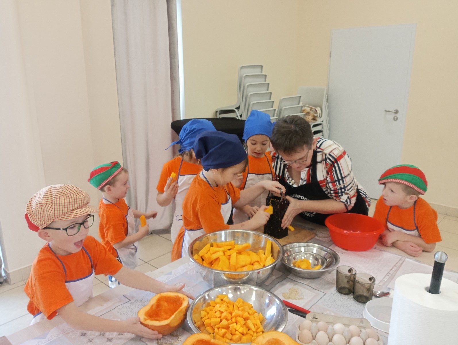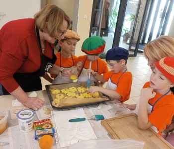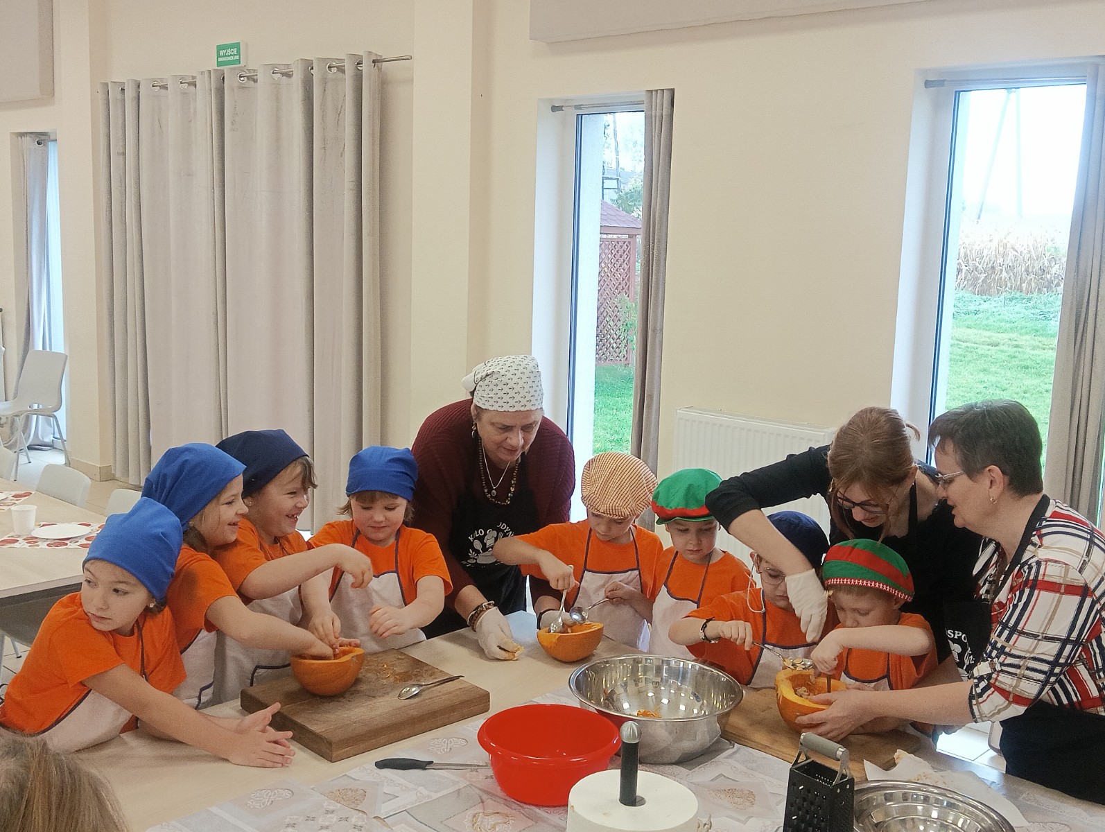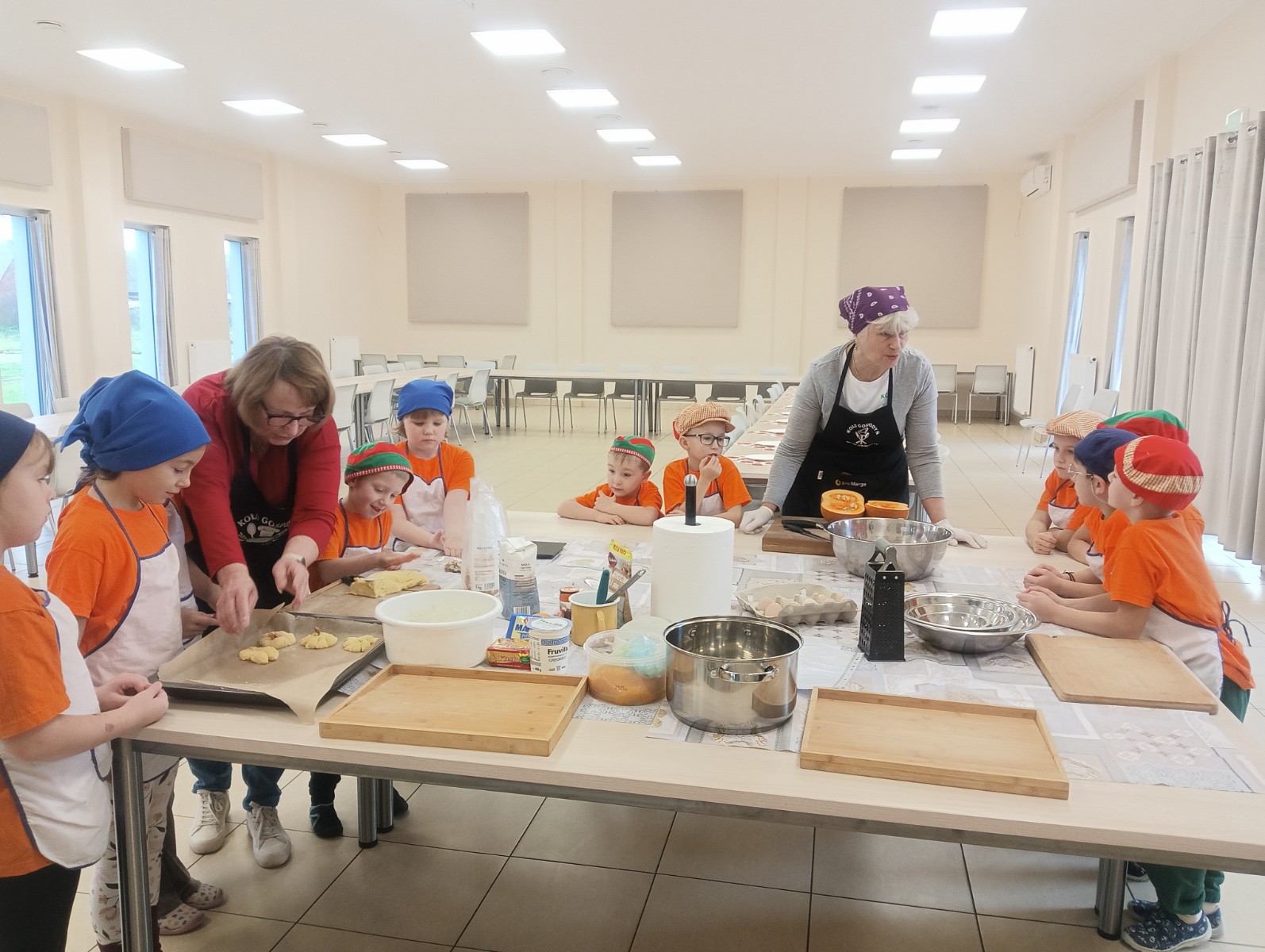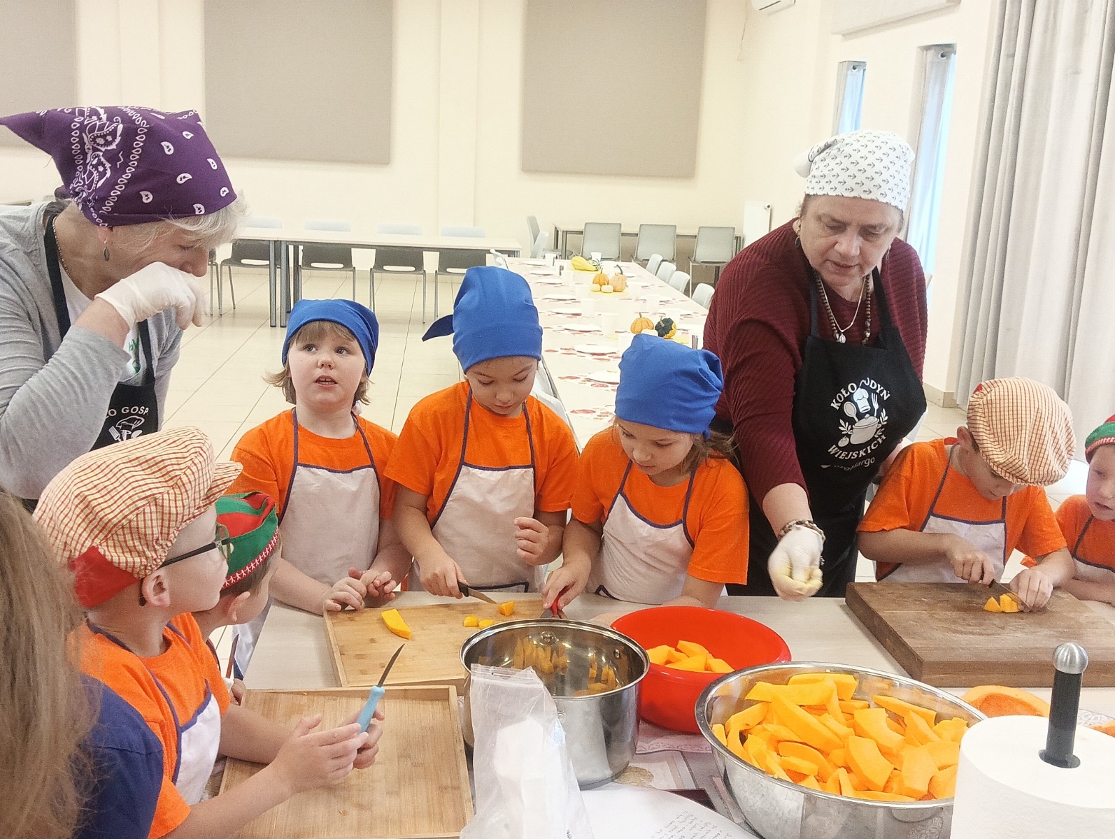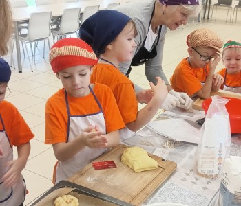 Dzieci wysłuchały porad i zabrały się do pracy, pomagając przy obróbce warzywa. Pierwsze zadanie polegało na wydrążeniu dyni, wyciągnięciu z niej pestek i zbędnego miąższu. W międzyczasie należało przygotować stanowisko do pracy. Następnie przeszliśmy do ostrożnego krojenia, ścierania dyni na tarce, odmierzania i dodawania innych niezbędnych składników. Kiedy powstały przysmaki, przystąpiliśmy do degustacji owoców naszej pracy. Spotkanie miało na celu nie tylko poznanie ciekawostek kulinarnych i nowych smaków. Dzięki użyciu dyni stało się ono zarazem świetnym ćwiczeniem sensorycznym, dlatego że jej obróbka wymaga więcej uwagi i posiada ona różne rodzaje faktury, a także różnorodną konsystencję. Dowiedzieliśmy się jak bardzo uniwersalne jest to sezonowe, jesienne warzywo i co można z niego przyrządzić. Co więcej, był to kolejny krok do nauki samodzielności i zaradności. Domowa atmosfera sprawiła, że zajęcia stały się przyjemnością i odskocznią od nauki w tradycyjnym rozumieniu. Bardzo dziękujemy Paniom z Koła Gospodyń Wiejskich, które poświęciły nam czas oraz podzieliły się swoją cenną wiedzą. Mamy nadzieję, że uda się nam podtrzymać współpracę i będzie nam dane wziąć udział w większej ilości ciekawych spotkań.