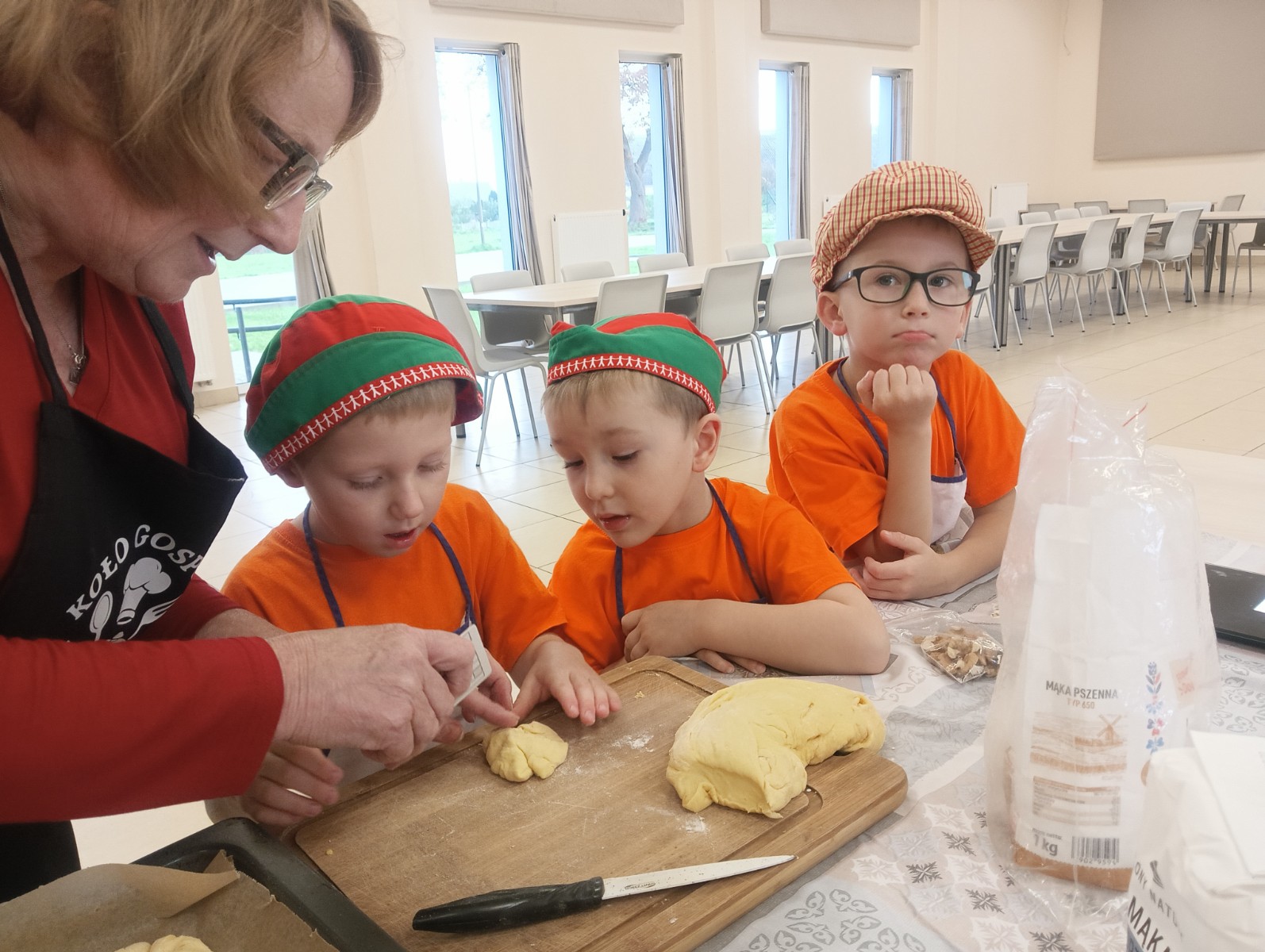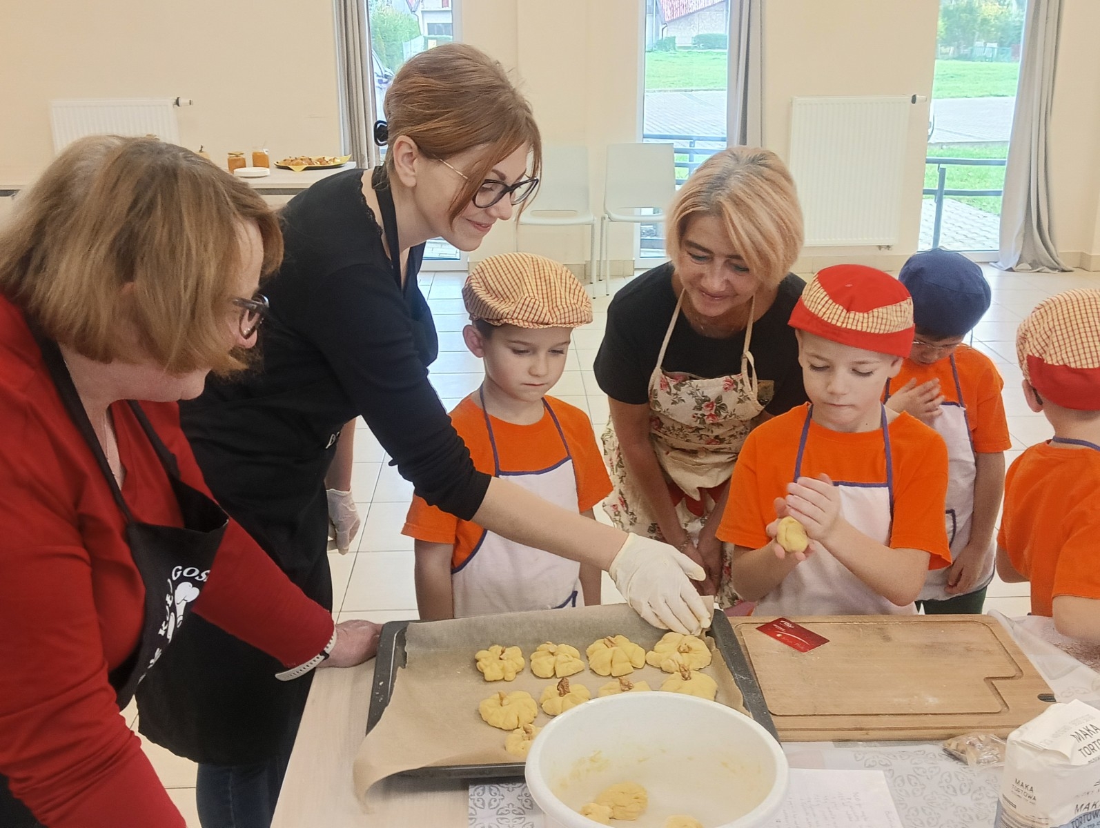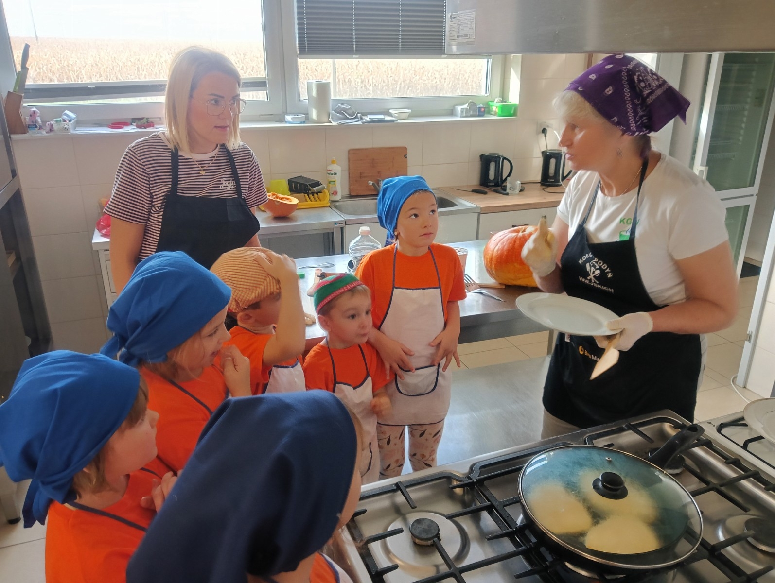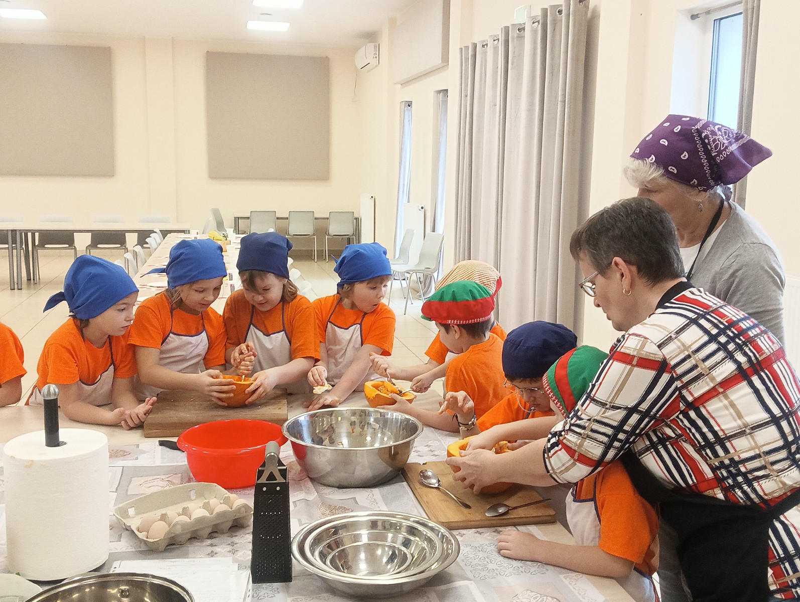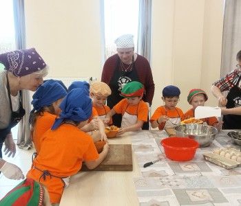 Dzieci wysłuchały porad i zabrały się do pracy, pomagając przy obróbce warzywa. Pierwsze zadanie polegało na wydrążeniu dyni, wyciągnięciu z niej pestek i zbędnego miąższu. W międzyczasie należało przygotować stanowisko do pracy. Następnie przeszliśmy do ostrożnego krojenia, ścierania dyni na tarce, odmierzania i dodawania innych niezbędnych składników. Kiedy powstały przysmaki, przystąpiliśmy do degustacji owoców naszej pracy. Spotkanie miało na celu nie tylko poznanie ciekawostek kulinarnych i nowych smaków. Dzięki użyciu dyni stało się ono zarazem świetnym ćwiczeniem sensorycznym, dlatego że jej obróbka wymaga więcej uwagi i posiada ona różne rodzaje faktury, a także różnorodną konsystencję. Dowiedzieliśmy się jak bardzo uniwersalne jest to sezonowe, jesienne warzywo i co można z niego przyrządzić. Co więcej, był to kolejny krok do nauki samodzielności i zaradności. Domowa atmosfera sprawiła, że zajęcia stały się przyjemnością i odskocznią od nauki w tradycyjnym rozumieniu. Bardzo dziękujemy Paniom z Koła Gospodyń Wiejskich, które poświęciły nam czas oraz podzieliły się swoją cenną wiedzą. Mamy nadzieję, że uda się nam podtrzymać współpracę i będzie nam dane wziąć udział w większej ilości ciekawych spotkań.