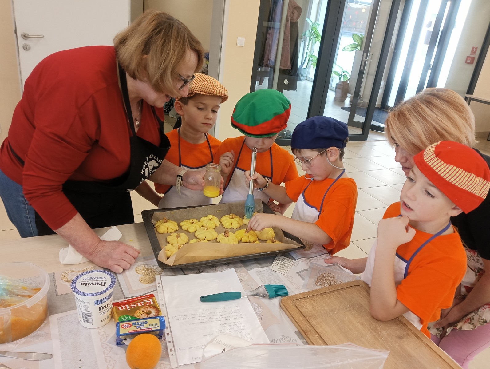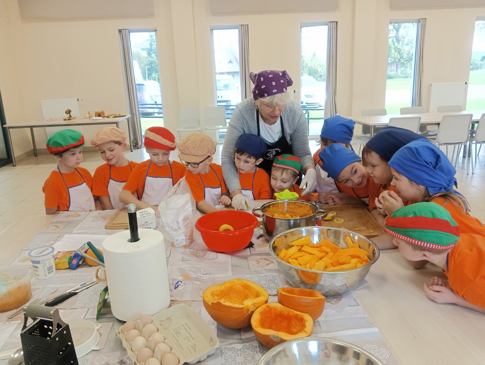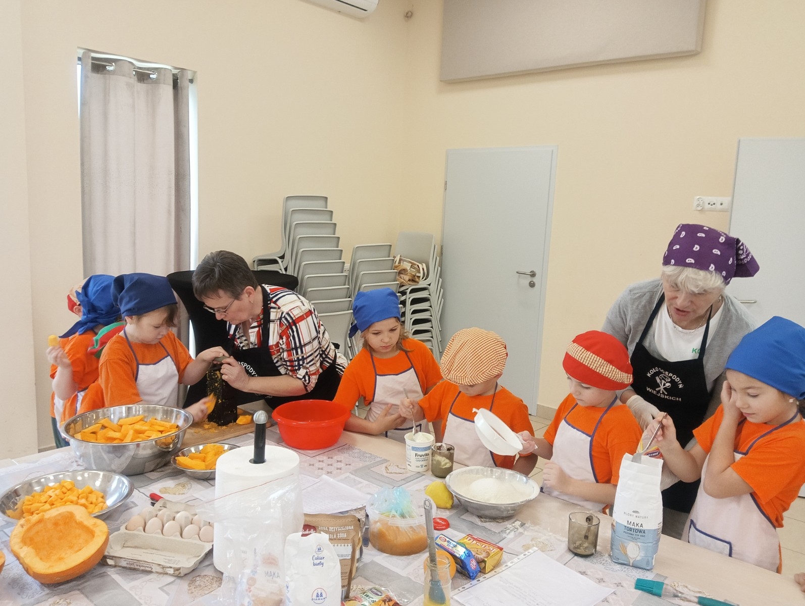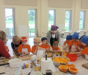 Ostatnio razem z naszymi podopiecznymi z grupy „Myszka Miki” mieliśmy okazję odwiedzić Panie z Koła Gospodyń Wiejskich w Lipinach. Spotkanie odbyło się na sali przy bibliotece w Lipinach. Tematem przewodnim i głównym składnikiem była dynia. Przygotowaliśmy aż trzy wypieki: babeczki, placki na słodko oraz ciasto i jeden napój, którym był dyniowy kompot.
