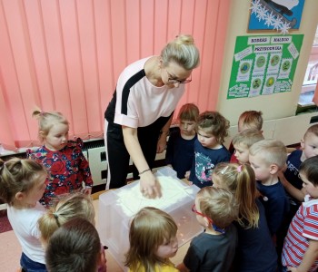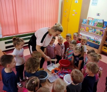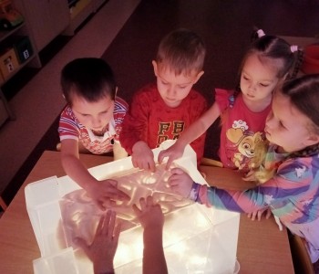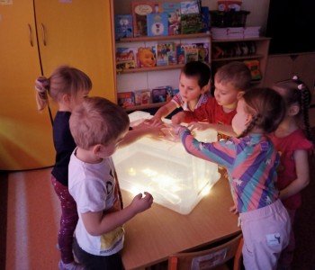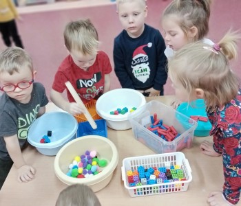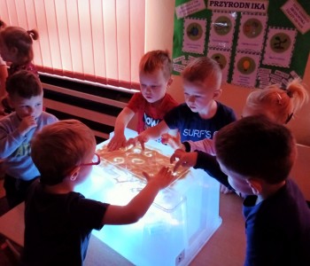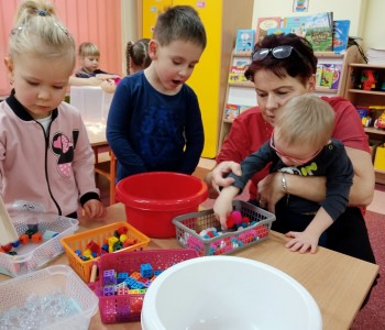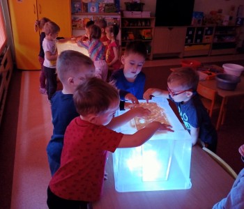 Maluszki z grupy „Krasnala Hałabały” malowały na podświetlanym pudełku sensorycznym oraz bawiły się szczypcami. Zabawy te znakomicie rozwijają koordynację wzrokowo – ruchową, koncentrację uwagi oraz usprawniają pracę ręki. Pudełko sensoryczne wspiera również dotyk, planowanie motoryczne oraz wyobraźnię. Pomysłów na zabawy ze szczypcami również jest wiele, można przekładać, układać, przenosić, segregować, przeliczać i wiele innych…każde dziecko znajdzie coś dla siebie – spróbujcie sami w domu