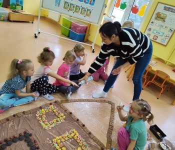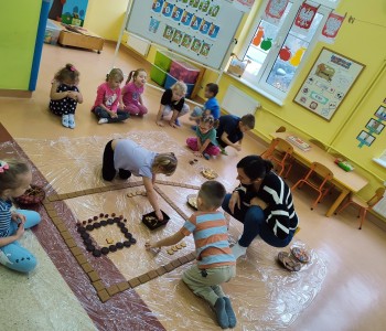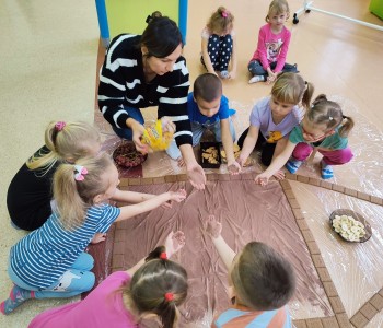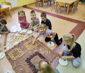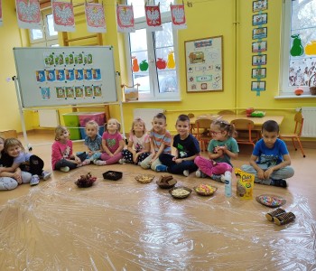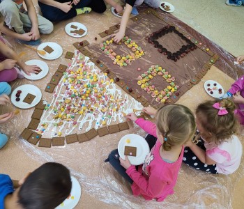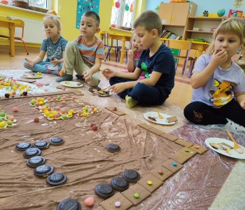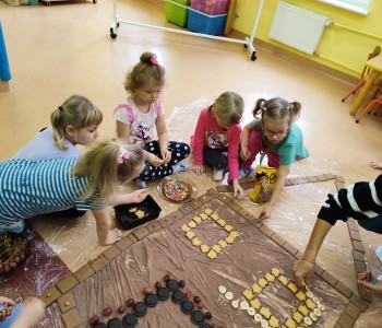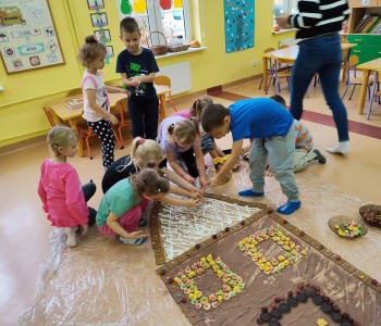 Chatka wyszła nam przepięknie ale również była smaczna. Dzieci miały ogromną radość z jej tworzenia, doznawały wielu wrażeń sensorycznych oraz uczyły się współpracy w grupie. Nasza praca była świetną zabawą połączoną z nauką i zakończyła się pyszną degustacją.