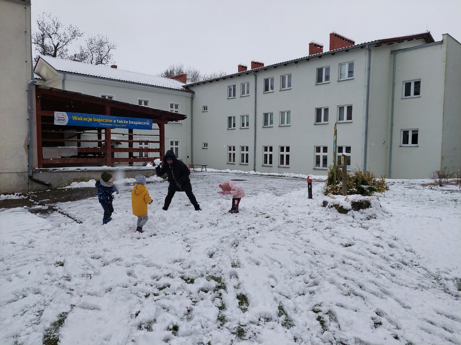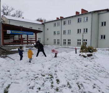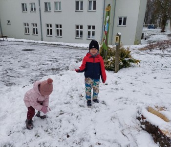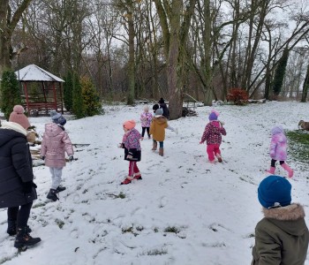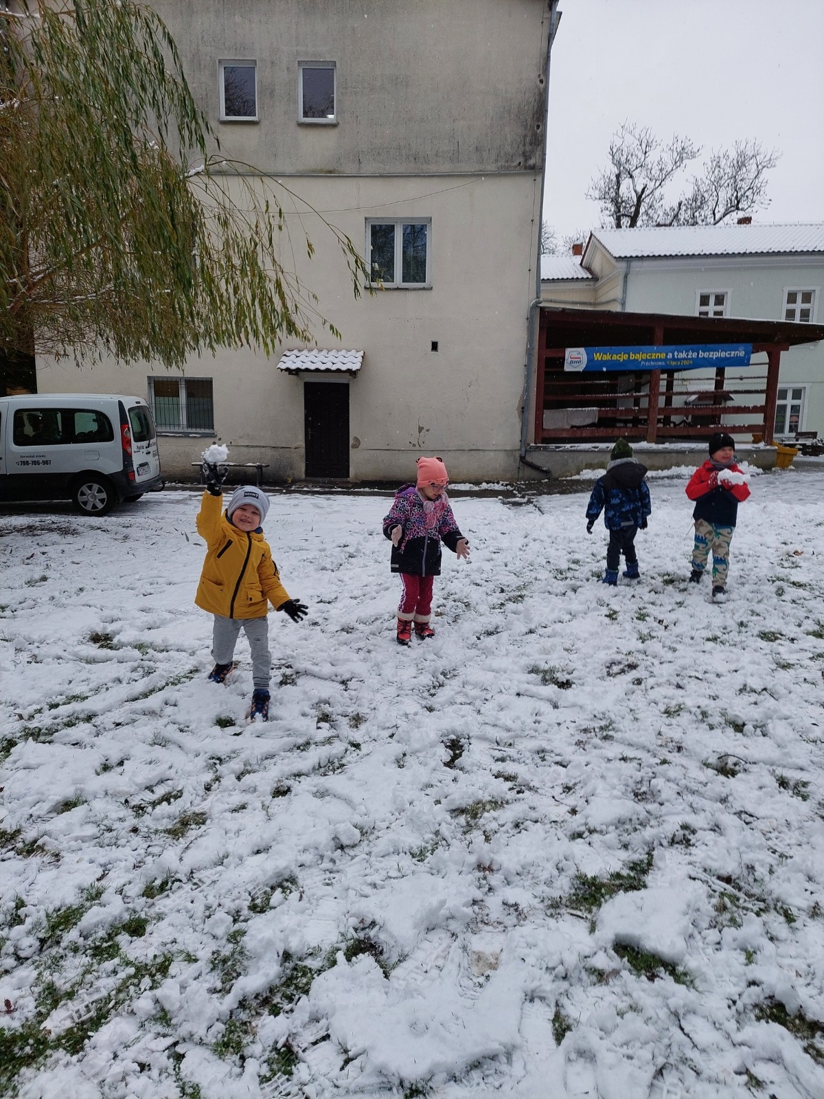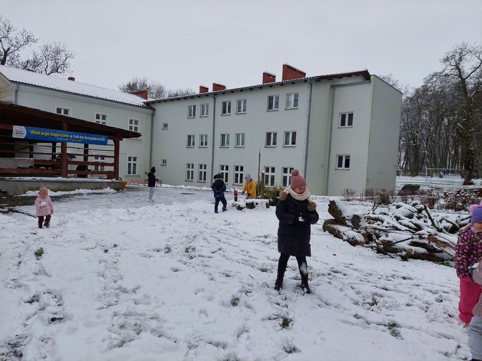 Pierwszy śnieg w tym roku szkolnym wywołał w grupie Koziołka Matołka prawdziwą falę radości. Już od rana przedszkolaki z podekscytowaniem zaglądały przez okna, obserwując wirujące płatki.