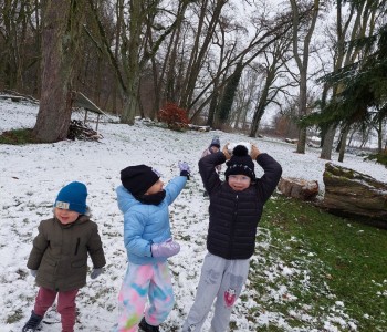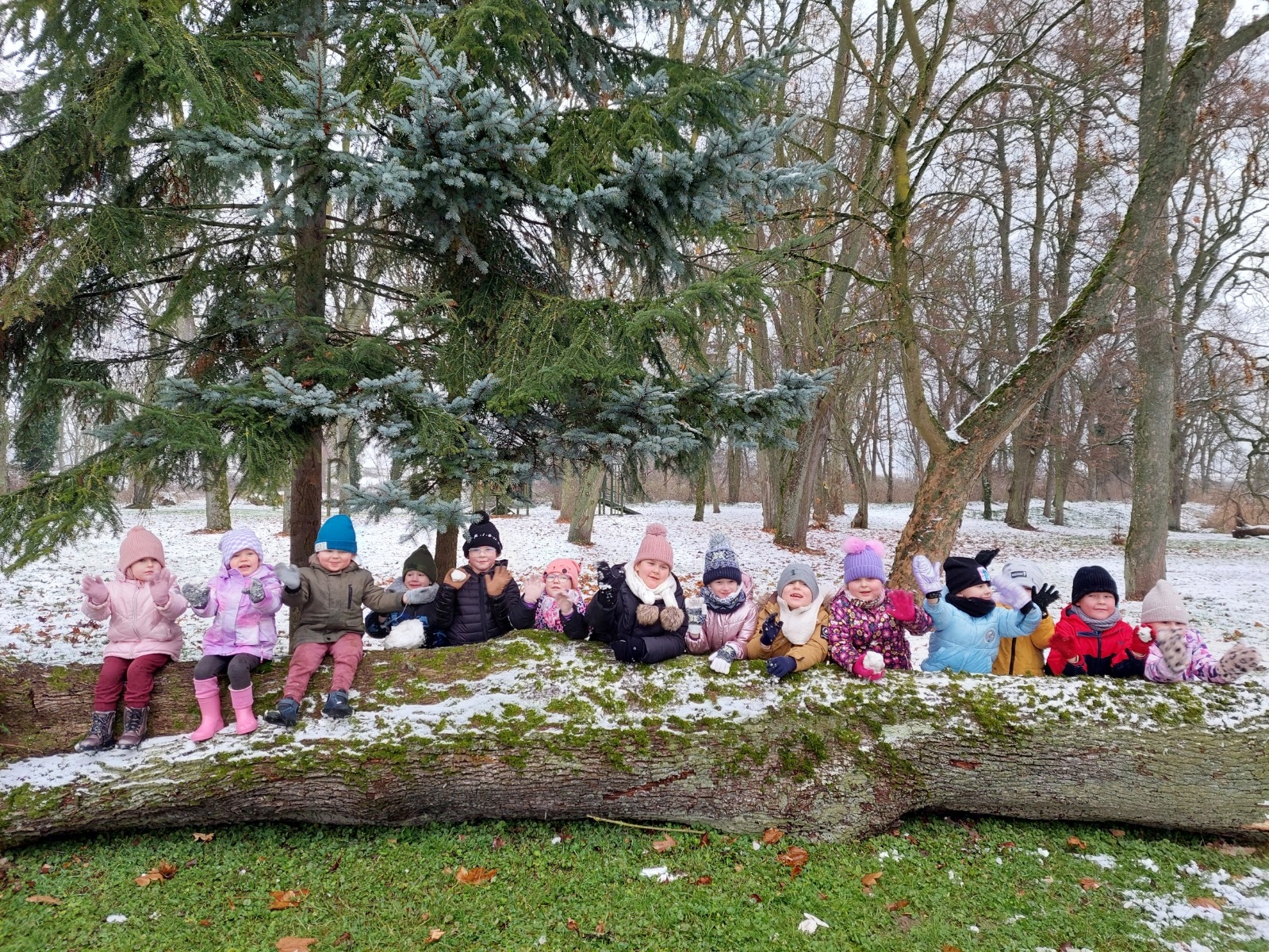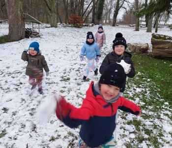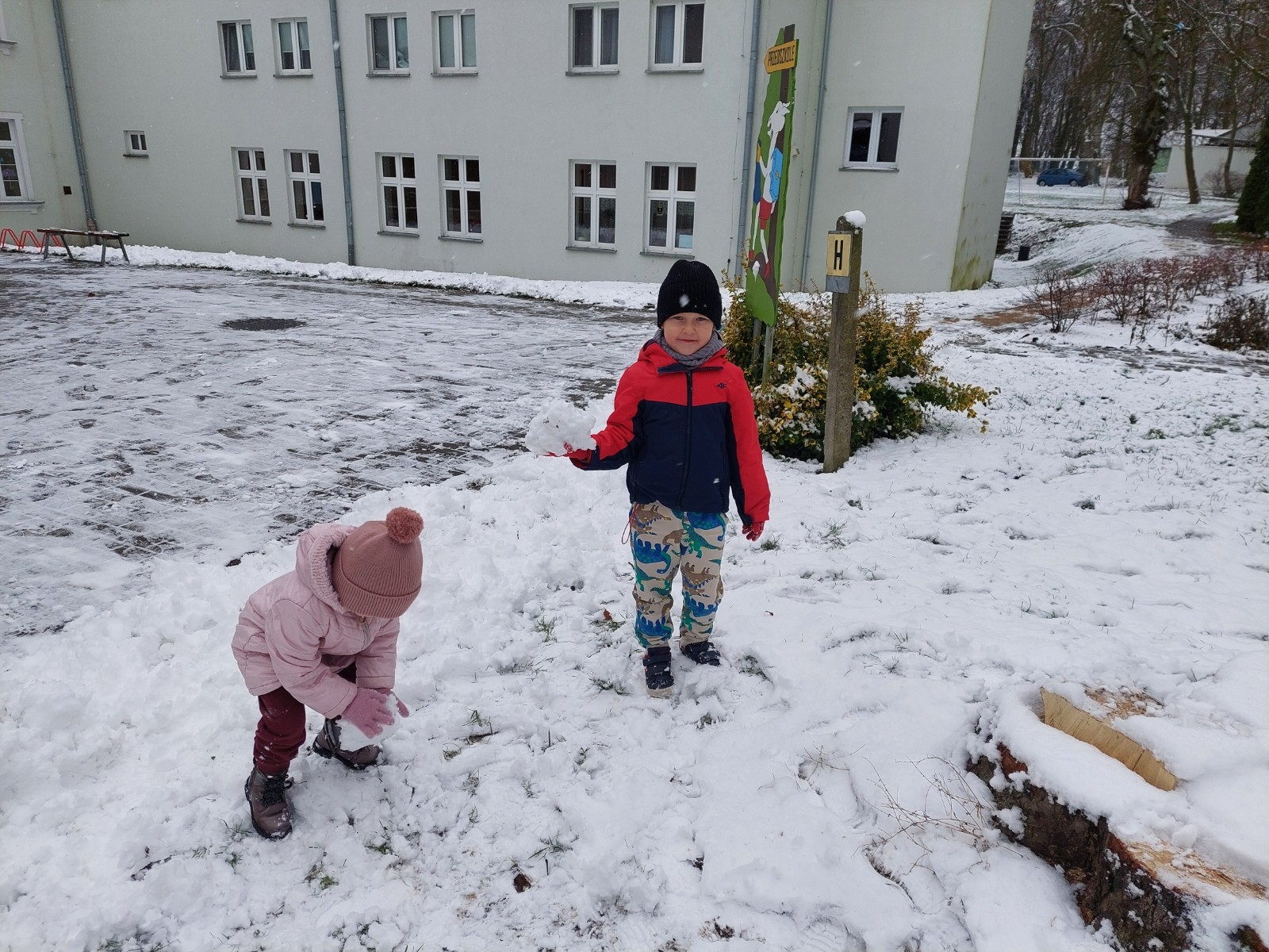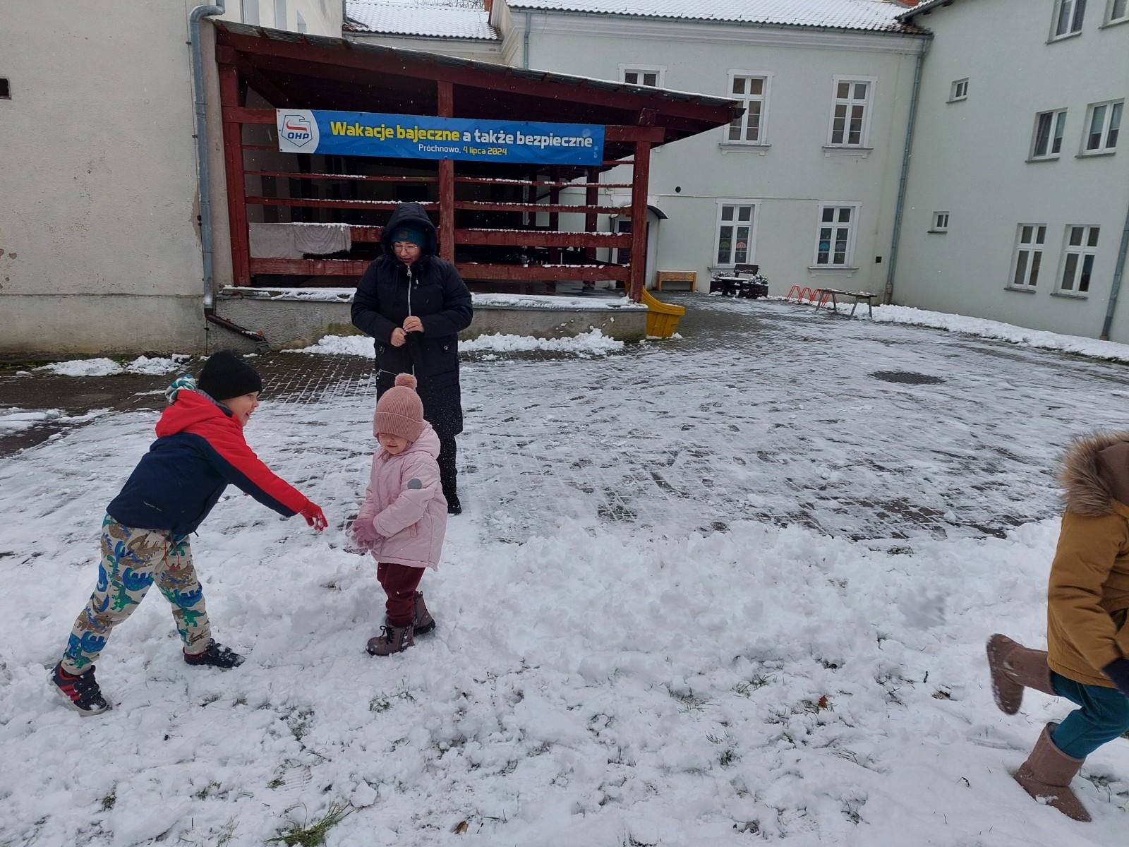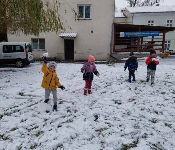 Pierwszy śnieg w tym roku szkolnym wywołał w grupie Koziołka Matołka prawdziwą falę radości. Już od rana przedszkolaki z podekscytowaniem zaglądały przez okna, obserwując wirujące płatki.