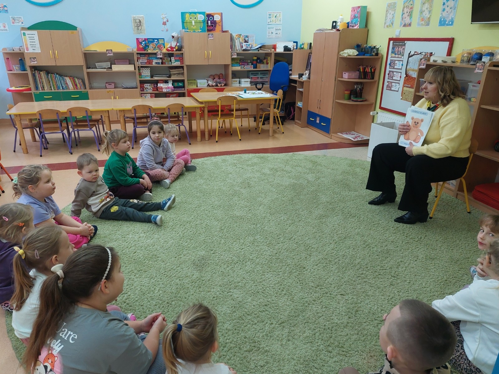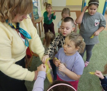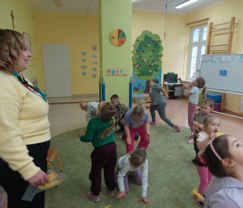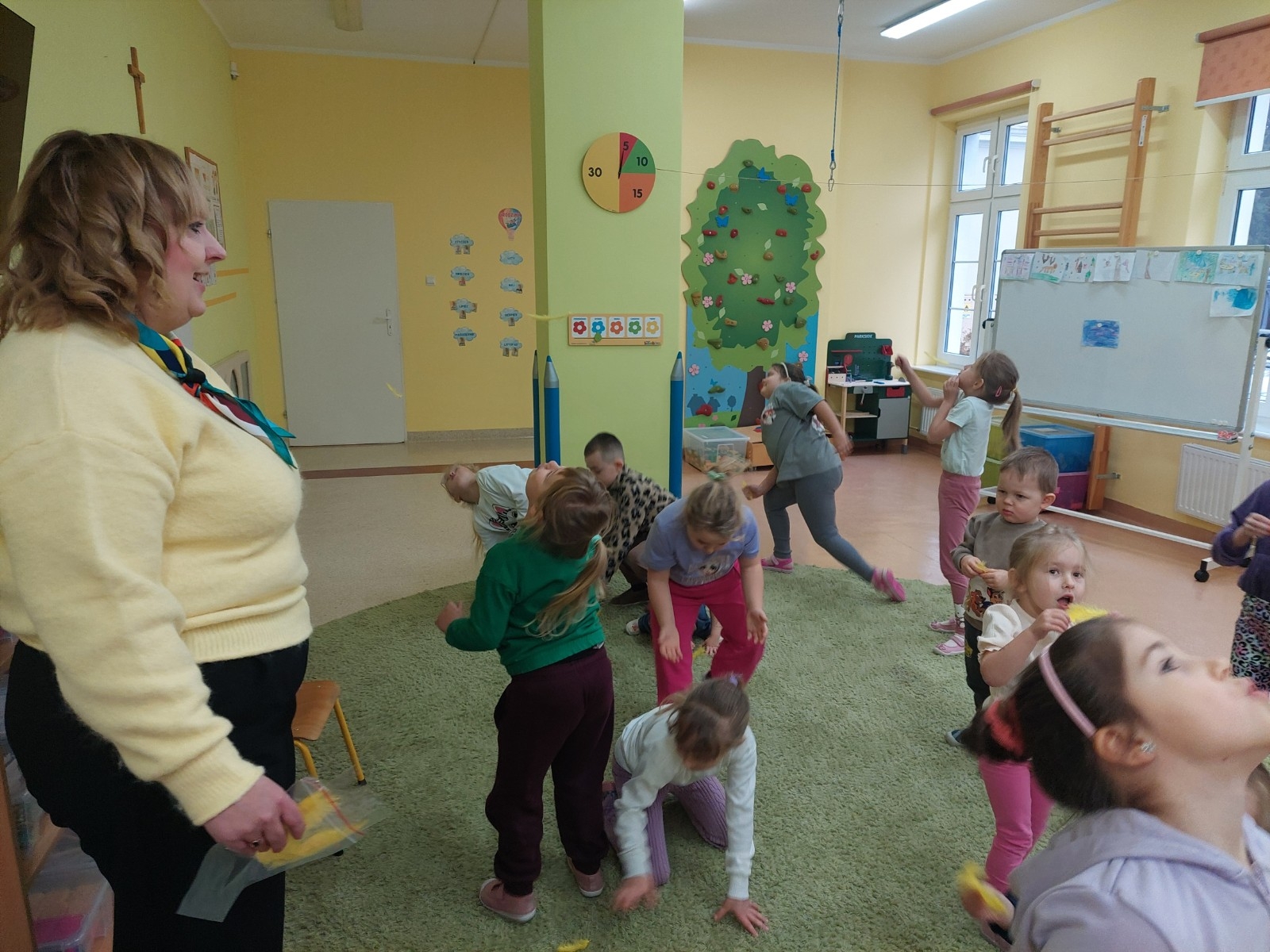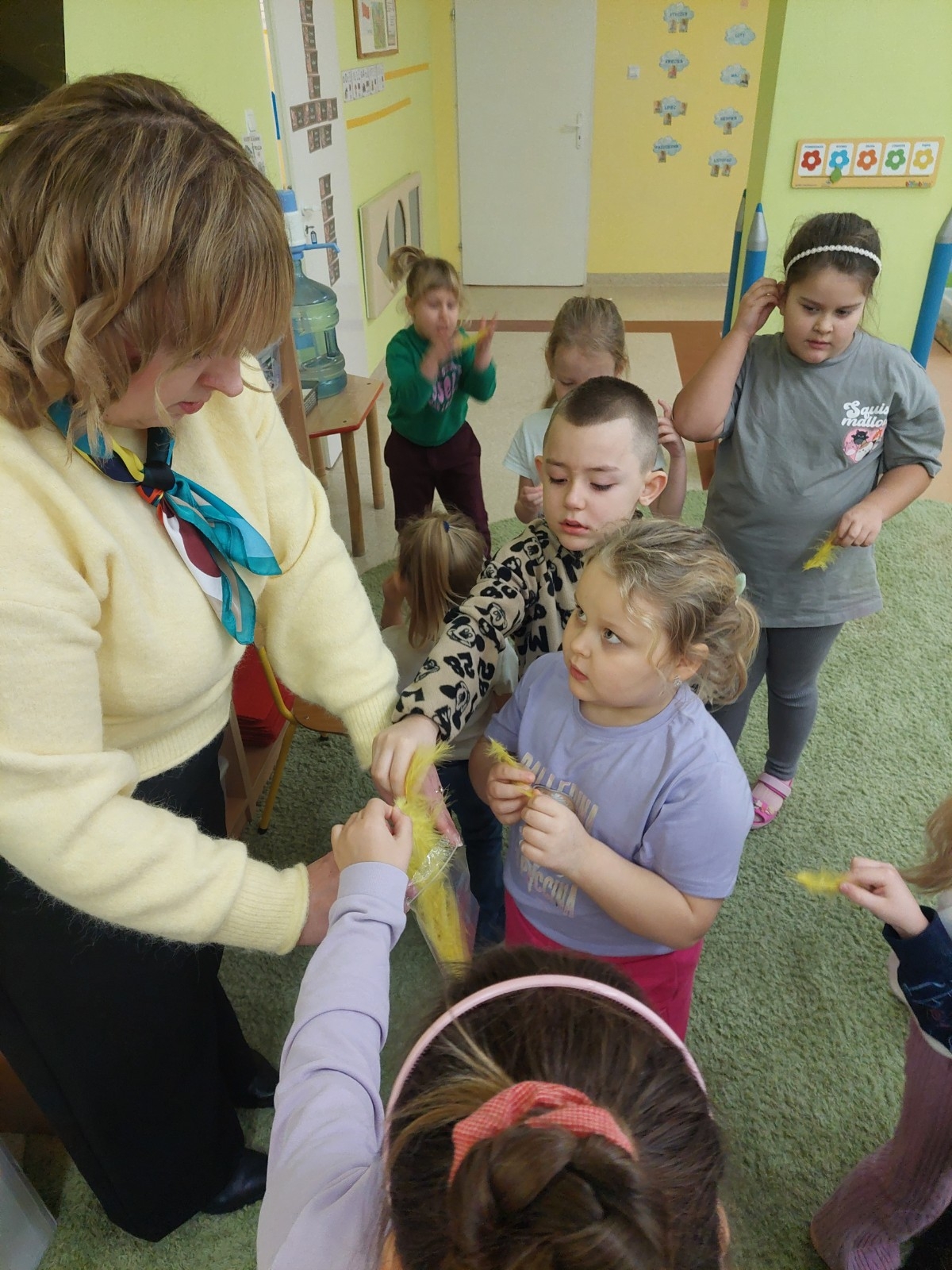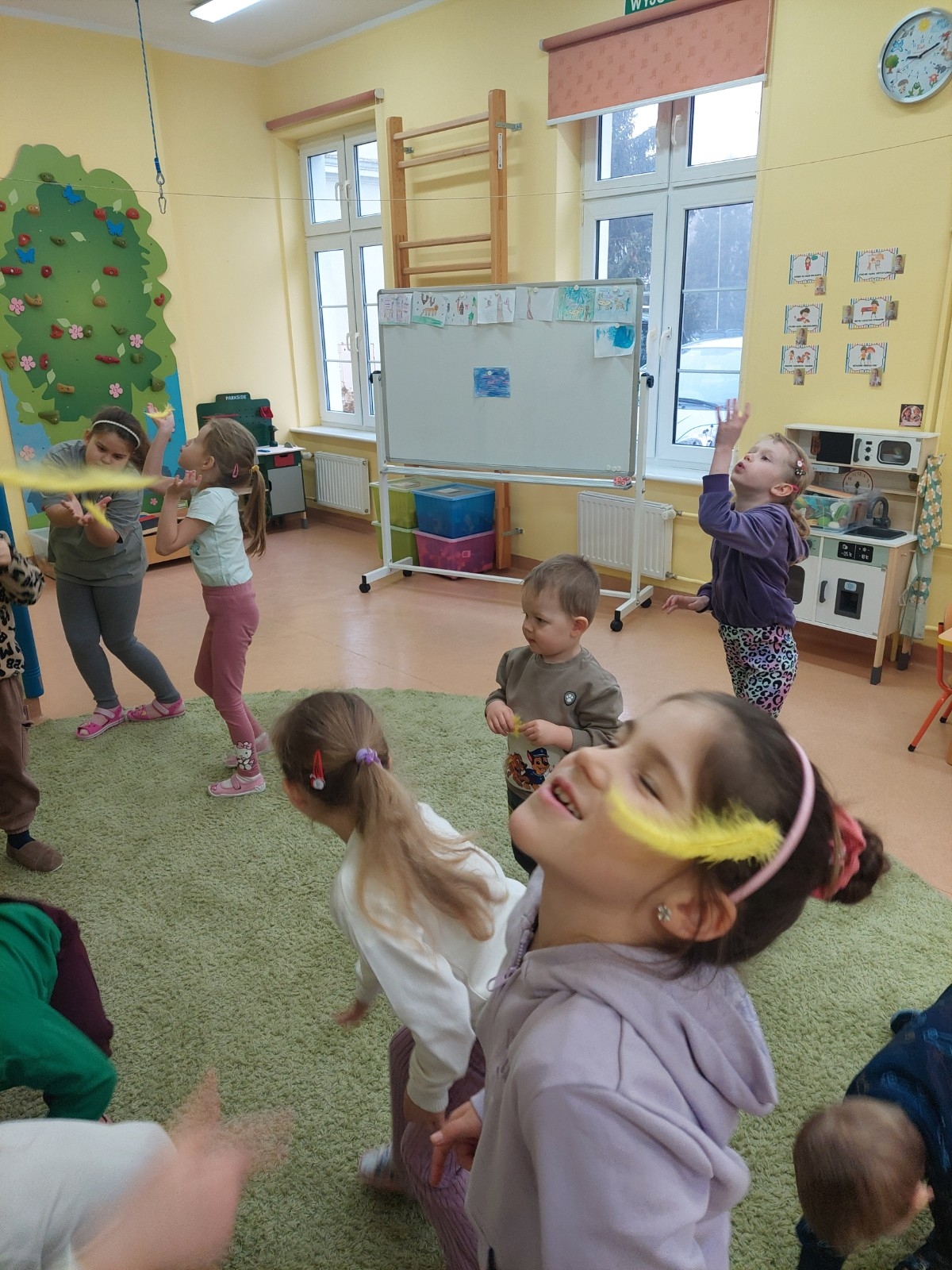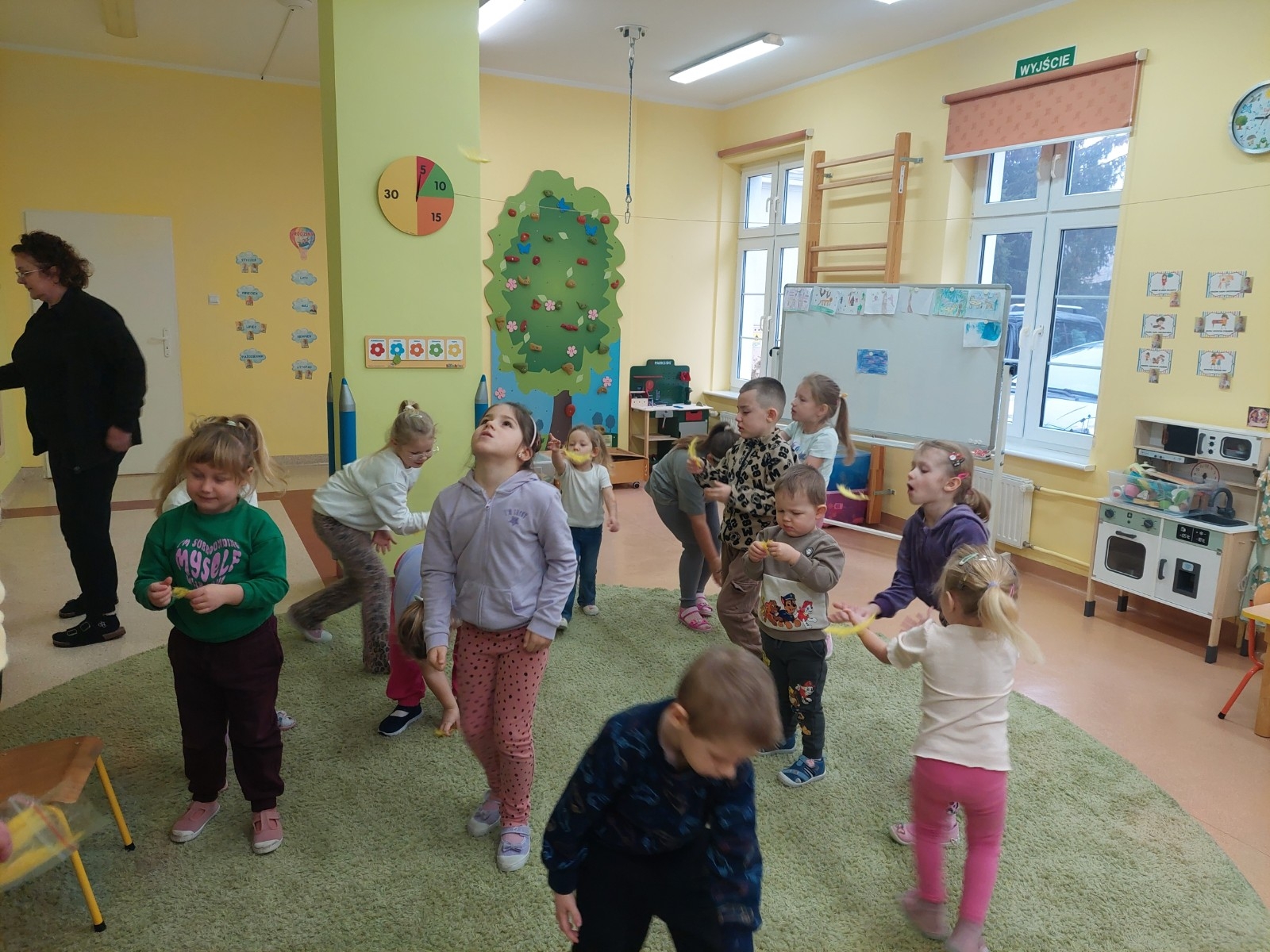 Podczas zajęć maluchy ćwiczyły prawidłową artykulację głosek poprzez zabawy słuchowe, oddechowe i ruchowe. Pani Agnieszka wykorzystała kolorowe pomoce dydaktyczne oraz elementy logorytmiki, które nie tylko ułatwiały skupienie uwagi, ale także wspierały rozwój koordynacji i świadomości językowej. Dzieci z zapałem powtarzały przygotowane ćwiczenia, uczestniczyły w zabawach dźwiękonaśladowczych i pracy z obrazkami, ucząc się poprawnej wymowy w atmosferze radości i bezpieczeństwa. Zajęcia nie tylko wzbogacały ich słownictwo, ale też budowały pewność siebie podczas wypowiedzi.