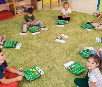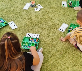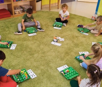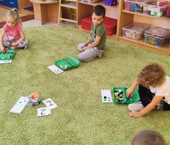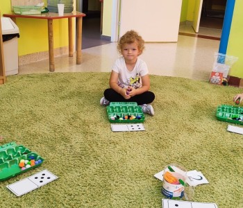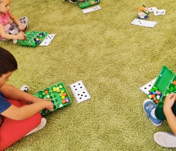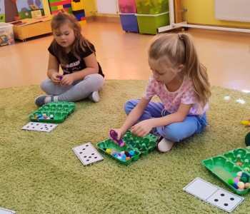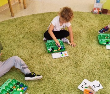 Przedszkolaki nie próżnują i już o poranku w przedszkolu chętnie rozwijają umiejętność liczenia oraz ćwiczą chwyt pęsetkowy podczas kolorowej zabawy z pomponami.