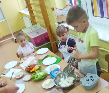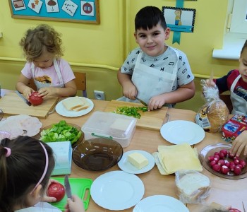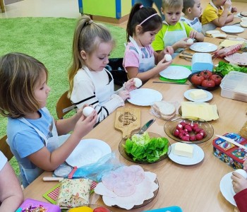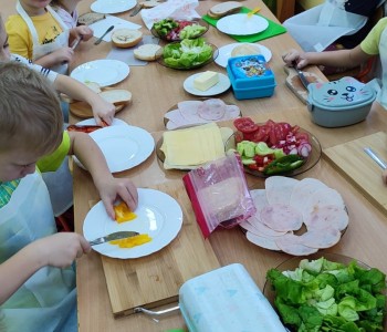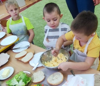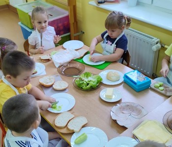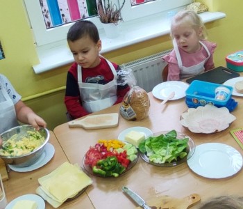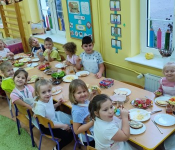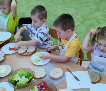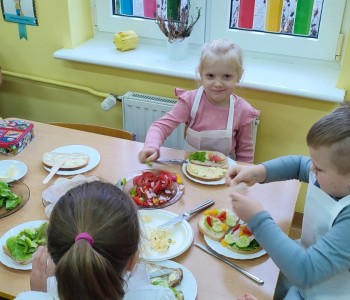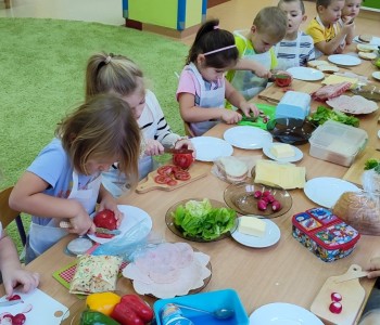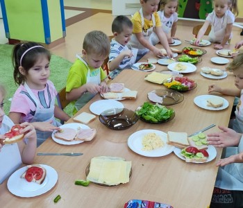Na ostatnim spotkaniu z panią pielęgniarką dzieci dowiedziały się o zasadach zdrowego odżywiania i jak ważną rolę odgrywa prawidłowe odżywianie. Następnie w ramach realizacji programu „Smyki i zdrowe smakołyki” dzieci samodzielnie wykonały śniadanie. Przygotowały pastę jajeczną ze szczypiorkiem, samodzielnie pokroiły warzywa, a następnie wykonały kolorowe i zdrowe kanapki, które potem znikały z talerzy. Dzieci podczas warsztatów kulinarnych kształtowały właściwe nawyki i umiejętności higieniczno-zdrowotne, kształtowały umiejętność współpracy w grupie oraz rozwijały wyobraźnię i inwencję twórczą.
