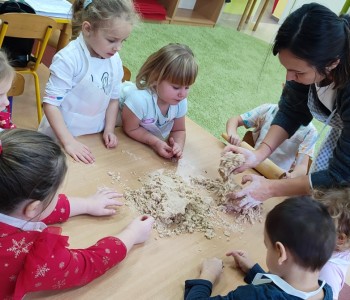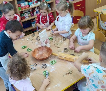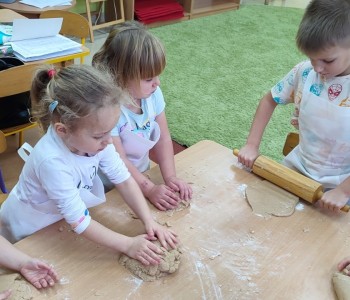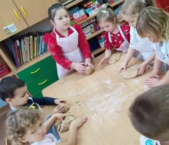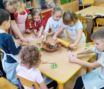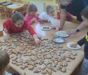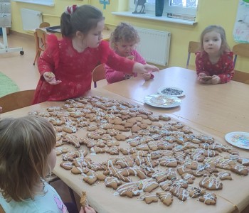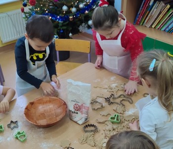 Święta już coraz bliżej, dlatego w naszej grupie nadszedł czas na pieczenie i dekorowanie świątecznych pierniczków. Dzieci po dokładnym umyciu rąk, dodawały składniki według przepisu i ochoczo zabrały się do pracy. Wspólnie wyrabiały ciasto, wykrawały foremkami w świątecznych kształtach pyszne ciasteczka. Następnie pierniczki zostały upieczone. Wspaniały zapach unosił się w całym przedszkolu i wprawił wszystkich w świąteczny nastrój.
