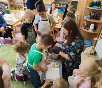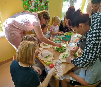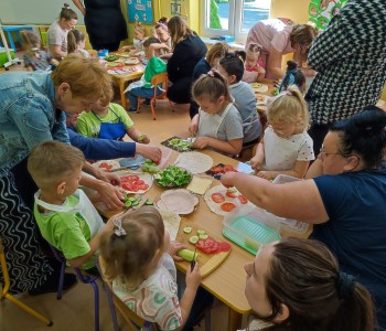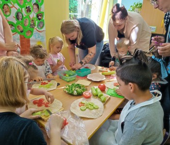 Pani dietetyk przedstawiła prezentację pt. „Śniadanie nie musi być nudne” – czyli jak zrobić śniadanie, aby dziecko chciało jeść przy niewielkim zasobie czasowym. Następnie wszyscy wspólnie przygotowali zdrowe śniadanie w kilka minut – tortillę śniadaniową pełną warzyw i witamin a na deser kulki mocy z suszonych owoców, orzechów i miodu. Dziękujemy pani dietetyk za przekazanie nam cennych wskazówek, za poświęcony czas a wszystkim za smaczne spotkanie.