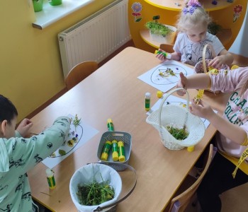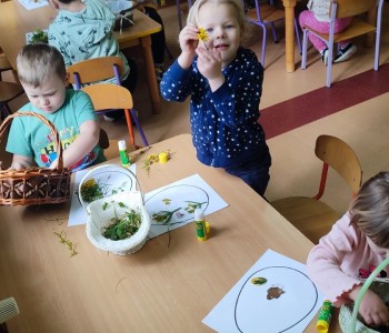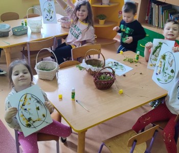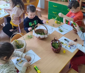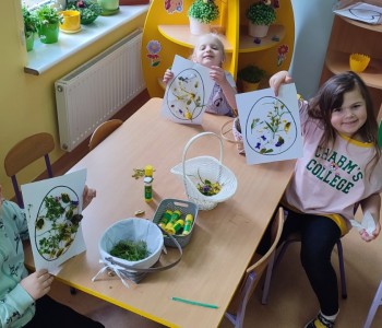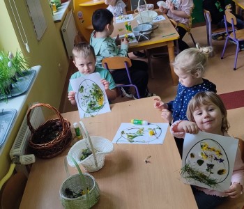 Podczas ostatnich zajęć dzieci z grupy Koziołka Matołka wykonały obraz pisanki z materiałów przyrodniczych znalezionych w najbliższej okolicy podczas wiosennego spacerku. Pogoda nam bardzo dopisała, a prace zainspirowane przyrodą - wyszły przepiękne.