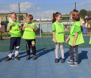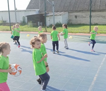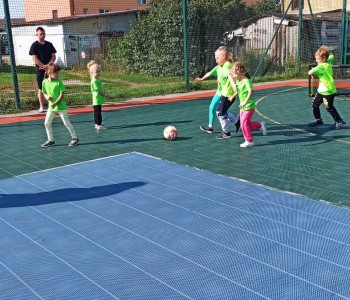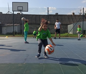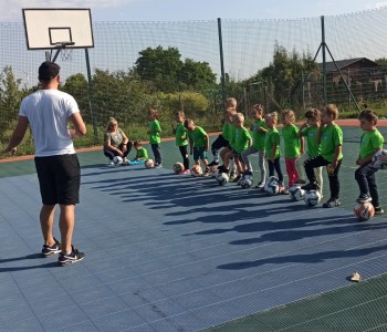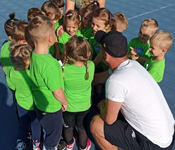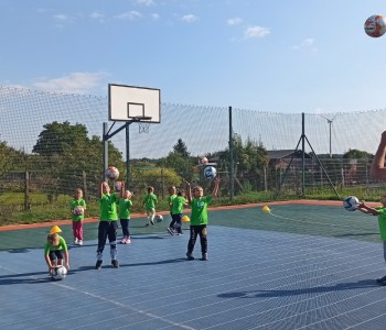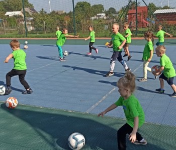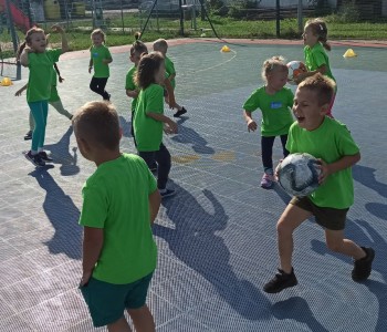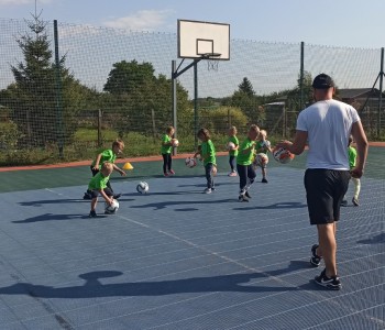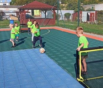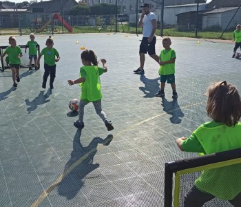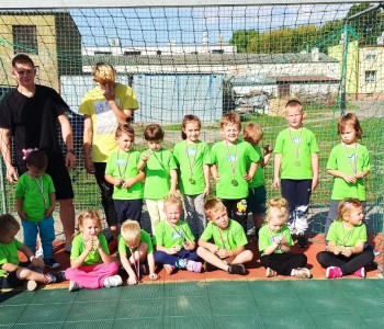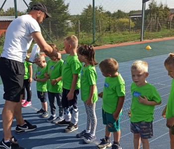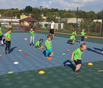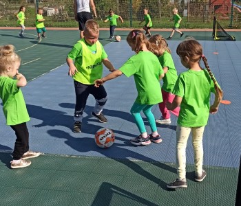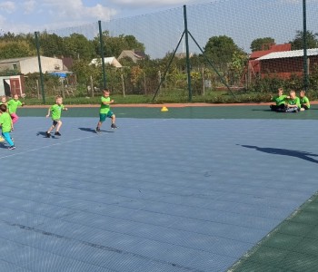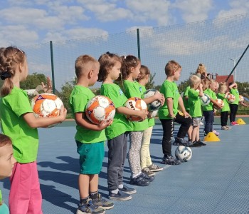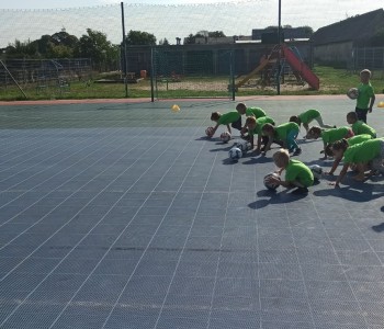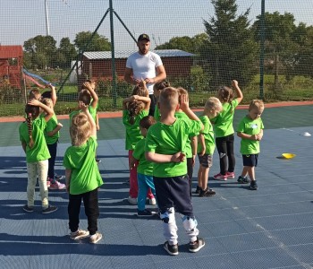 Wspólnie przenieśliśmy się na boisko na którym odbył się trening i mini zawody sportowe. Trener zachęcał do trenowania piłki nożnej i innych dyscyplin sportu, a najlepiej systematycznie, gdyż przynosi to wiele satysfakcji i radości. Wszystkie zabawy i ćwiczenia przysporzyły dzieciom dużo radości i uśmiechu. Każdy sportowiec otrzymał złoty medal.