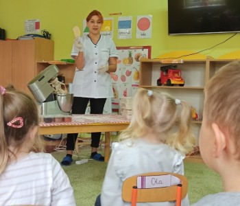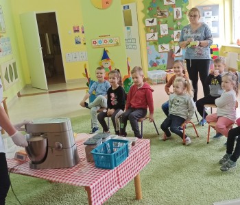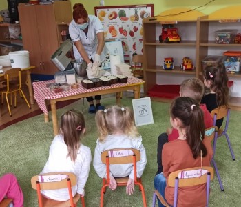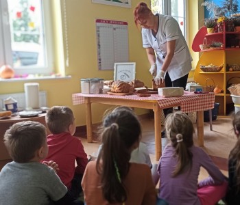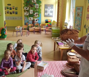 W piątkowe przedpołudnie dzieci z grupy Koziołka Matołka odwiedził gość – pani piekarz z Oporzyna. Dzieci miały okazję dowiedzieć się na czym polega praca piekarza oraz jak powstaje chleb. Pani piekarz pokazała kolejne etapy powstawania chleba oraz dała wiele cennych wskazówek jak upiec chleb by był zdrowy. Na koniec spotkania przedszkole wypełnił zapach świeżego chleba, który dzieci zjadły z dużym apetytem. Zapraszamy do naszej galerii zdjęć.