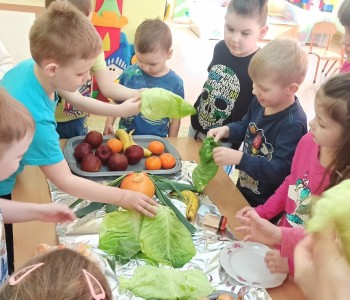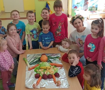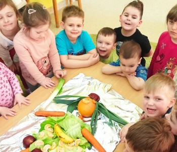 Najwięcej radości dzieciom przysporzyło ostatnie zadanie, które polegało na wykonaniu Marzanny z owoców i warzyw. Na koniec nasza kolorowa i zdrowa Marzanna została przez nas zjedzona i wyruszyliśmy na spacer by razem śpiewając i grając głośno powitać Panią Wiosnę.