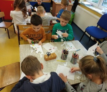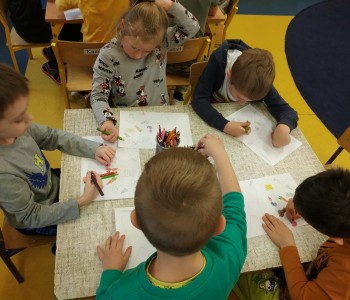Na zakończenie spotkania wykonały pracę plastyczną „Wesoły ząbek”. Zadaniem dzieci było pokolorować, wyciąć i nakleić na kontur zęba tylko zdrowe produkty.