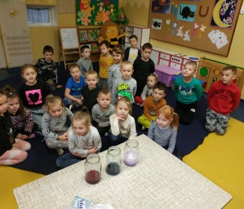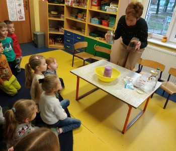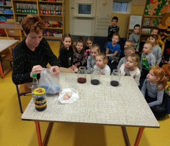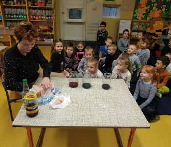 Podczas spotkania z panią pielęgniarką dzieci dowiedziały się co dzieje się z zębami, gdy zapominamy o ich myciu. Podczas doświadczenia wykonanego przez panią pielęgniarkę dzieci dowiedziały się jak na nasze zęby działają różne substancje. Dzieci obiecały, że będą codziennie myć zęby.
