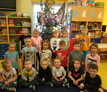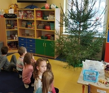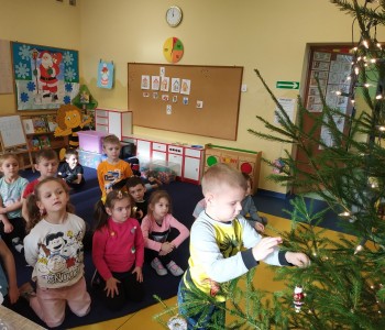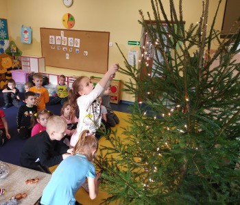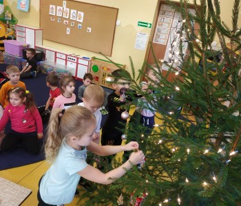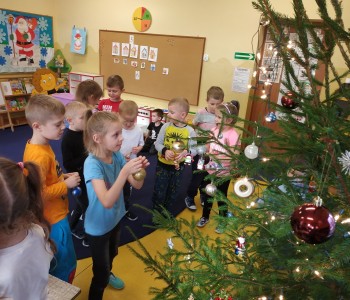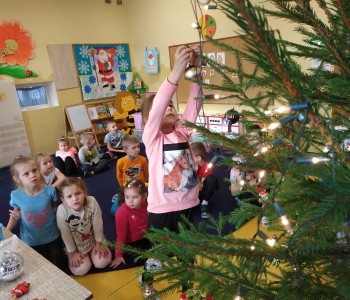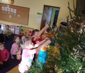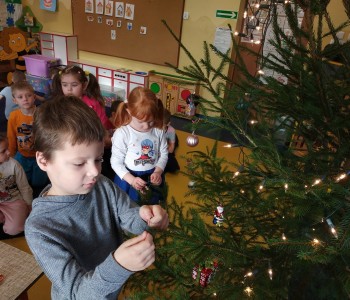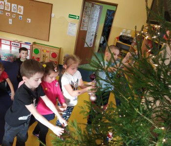 W piątek w sali grupy Pszczółki Mai pojawiła się choinka. Zadaniem dzieci było jej udekorowanie. Dzieci z wielkim zapałem zawieszały bombki na choinkę.
