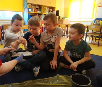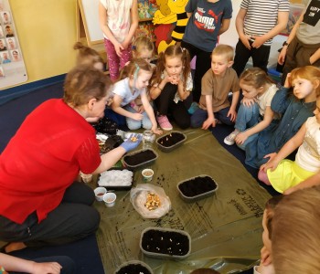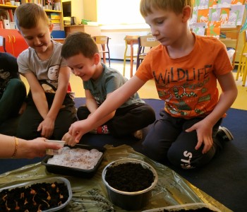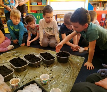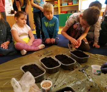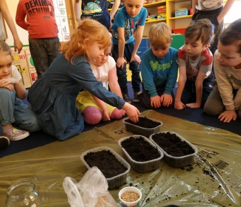 Starszacy postanowili założyć w swojej sali swój ogródek więc zamienili się w małych ogrodników. Samodzielnie wysiały nasiona rzeżuchy i zboża oraz posadziły fasolę, groch i cebulę. Dzieci wiedzą, że do rozwoju roślin potrzebna jest woda i słońce, dlatego doniczki zostały ustawione na parapecie. Teraz z niecierpliwością czekają na pierwsze kiełkujące rośliny.