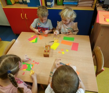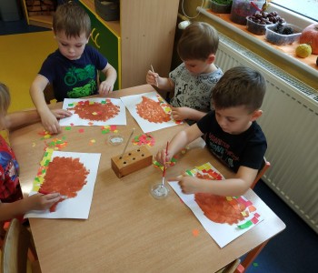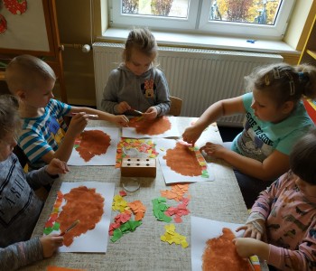 Następnie wykorzystując małe gąbki pomalowały kontur jeża, a następnie pocięły kolorowe kartki, które przykleiły pod jeżykiem robiąc mu jesienny dywan z liści.