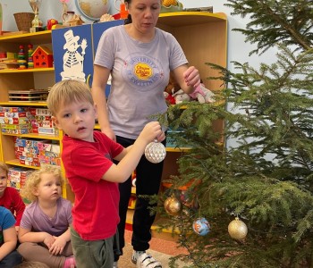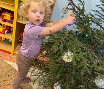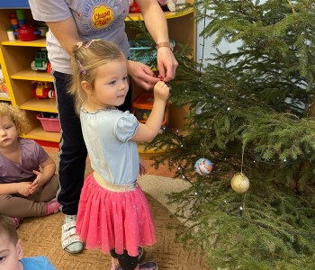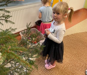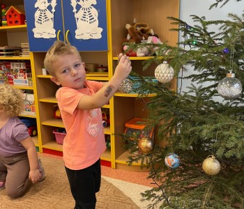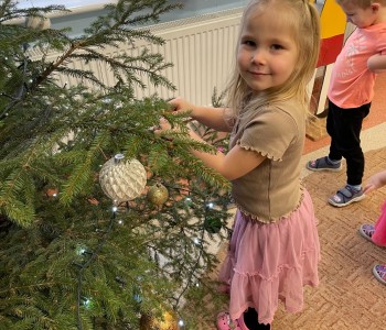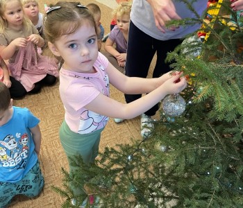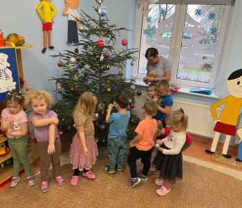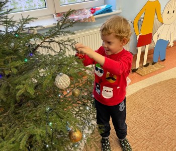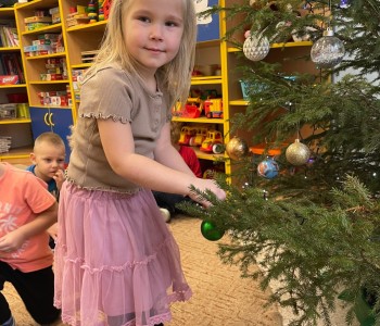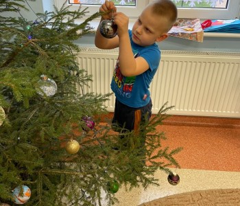 5 grudnia dzieci z grupy Bolka i Lolka postanowiły udekorować swoją choinkę. Prz4dszkolaki zawieszały lampki, bombki i gwiazdki. Choinka wyglądała prześlicznie. Ileż było radości wśród dzieci a w sali od razu zrobiło się świątecznie i bajkowo.