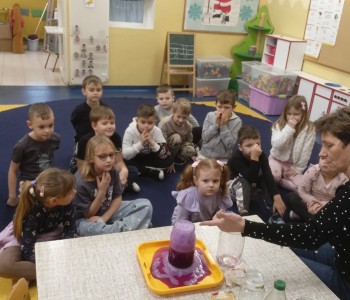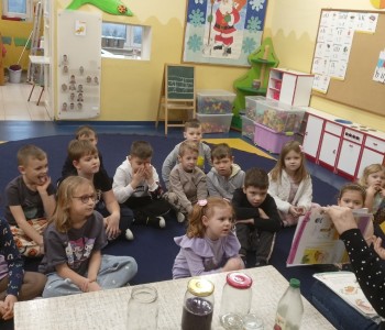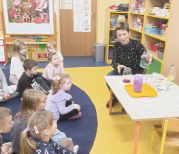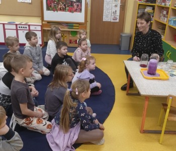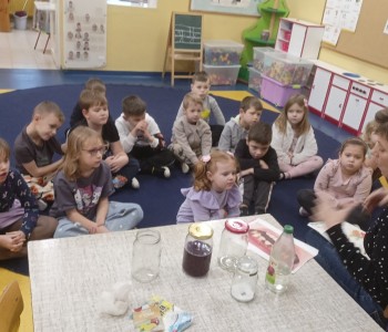 Podczas doświadczenia wykonanego przez panią pielęgniarkę dzieci dowiedziały się jak na nasze zęby działają różne substancje. Dzieci obiecały, że będą codziennie myć zęby. Na zakończenie spotkania wykonały pracę plastyczną „Wesoły ząbek”. Zadaniem dzieci było pokolorować, wyciąć i nakleić na kontur zęba tylko zdrowe produkty.