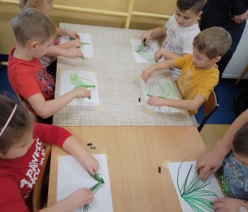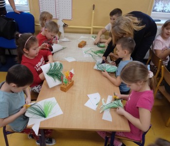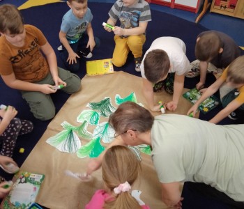 Rozwiązywały zagadki o tematyce świątecznej oraz dzieliły wyrazy na sylaby i wyodrębniały głoski w nagłosie i wygłosie wyrazów. Wykorzystując metodę Edukacji przez Ruch dzieci rozwijały koordynację wzrokowo – słuchowo – ruchową. Poruszały się zgodnie z rytmem słyszanej melodii, wystukiwały rytm a następnie przy muzyce rysowały wiązkę kresek wychodzących z jednego punktu. Po wycięciu powstałych wiązek wspólnie ułożyły i przykleiły choinkę, którą ozdobiły bombkami ze swoimi imionami. Dziękujemy rodzicom za przybycie do przedszkola i wspólne spędzenie czasu ze swoimi dziećmi.