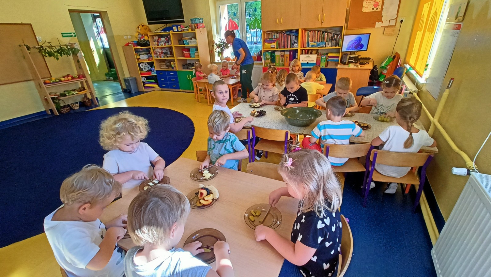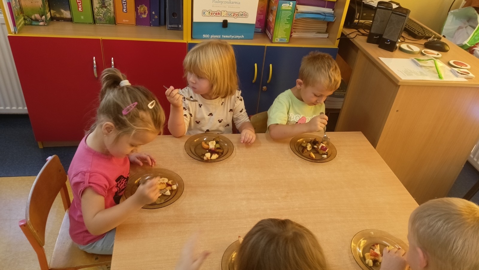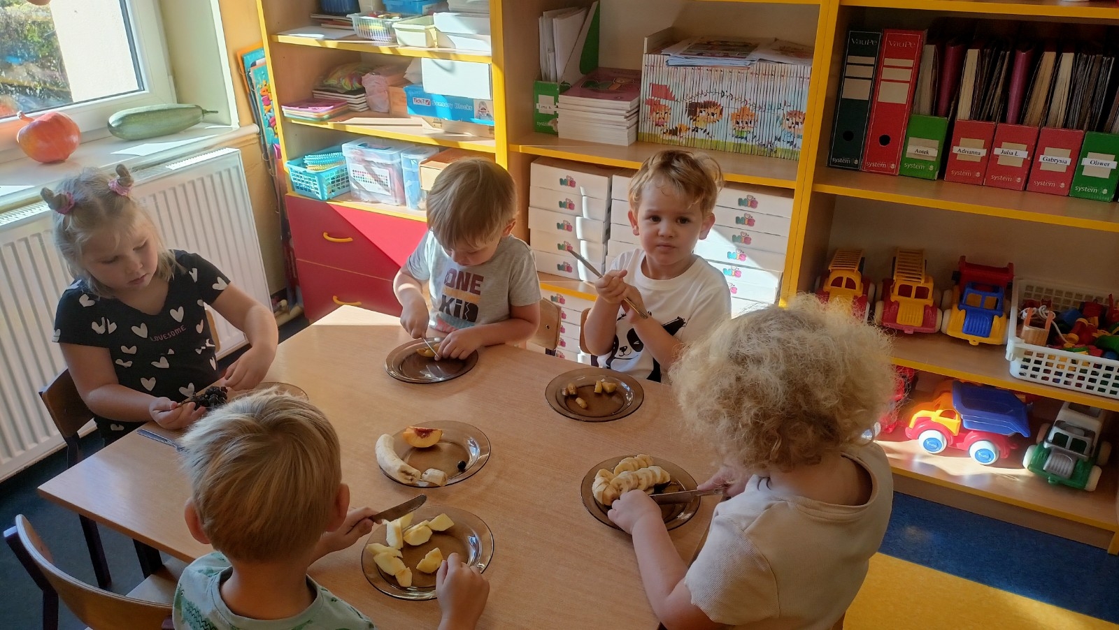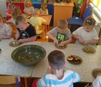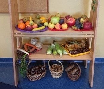 Wraz z nadejściem nowej pory roku – jesieni wspólnie z dziećmi założyliśmy kącik przyrody, w którym znalazły się różne dary jesieni zarówno z parku jak i ogrodu i sadu. Rozmawiając o owocach dzieci dowiedziały się o dużej wartości odżywczej owoców. Poznały narządy zmysłów dzięki którym odkrywamy świat, dlatego dzieci smakowały, oglądały, dotykały i wąchały owoce z polskich sadów.