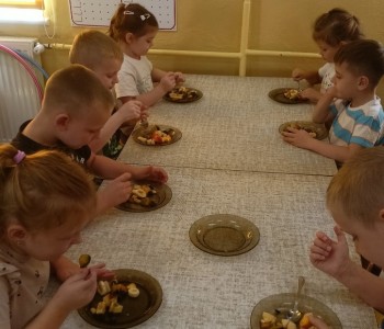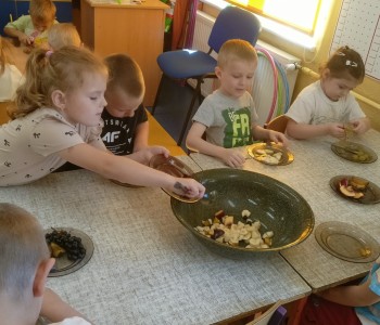 Następnie przedszkolaki zrobiły pyszną sałatkę owocową wykorzystując owoce krajowe. Po pracy odbyła się degustacja - sałatka wszystkim bardzo smakowała. Alina Zaborowska