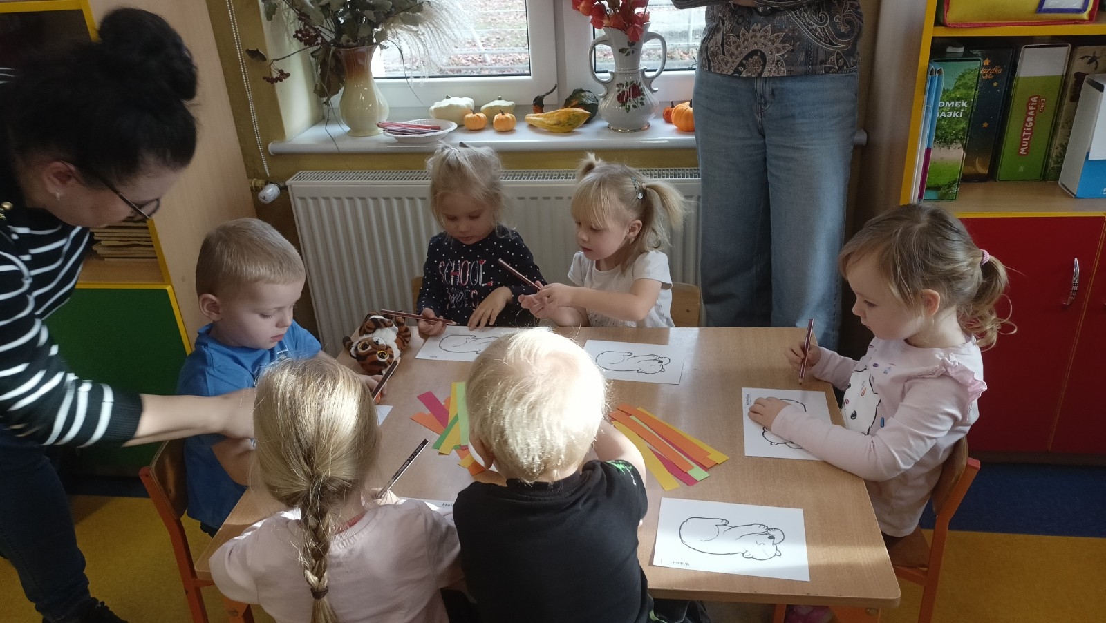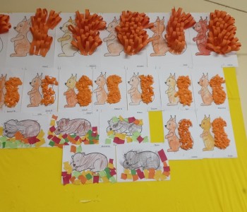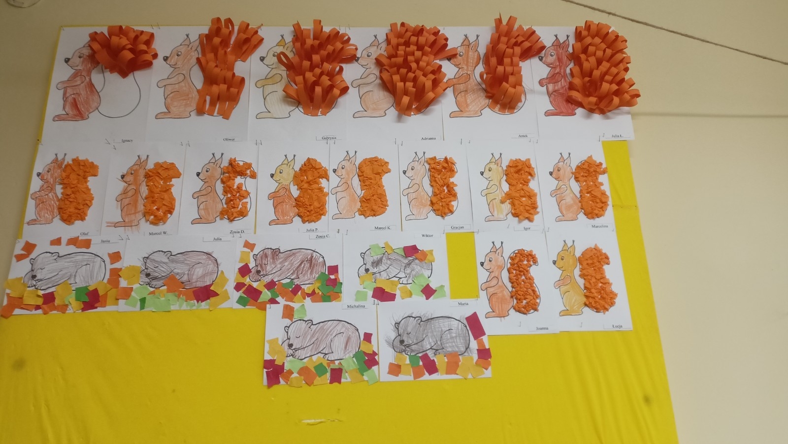 Następnie wykonały wiewiórki oraz niedźwiedzie wykorzystując różne techniki plastyczne takie jak: kolorowanie konturów kredkami, wyklejanie ogona wiewiórki kulkami z krepy i paskami papieru i naklejanie legowiska dla niedźwiedzia kolorowymi karteczkami. Było nam niezmiernie miło gościć w przedszkolu wszystkich obecnych rodziców. Alina Zaborowska