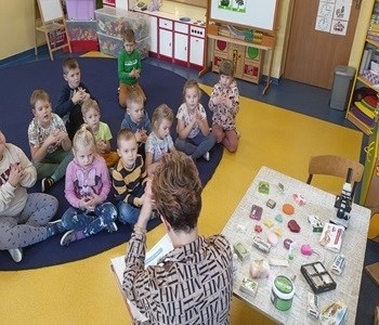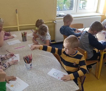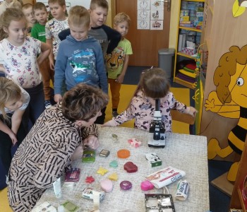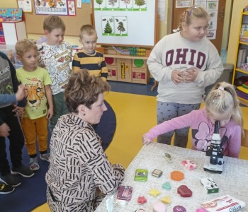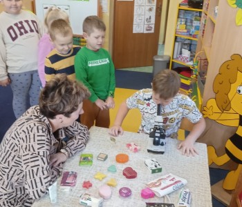 Utrwalały kolejność wykonywanej czynności jakim jest mycie rąk. Dzieci dowiedziały się o zarazkach, bakteriach i wirusach, które dostają się do naszego organizmu poprzez brudne ręce. Miały okazję zobaczyć takie wirusy przez mikroskop. Na zakończenie spotkania dzieci pokolorowały obrazki, które również będą przypominały dzieciom o myciu rąk.