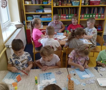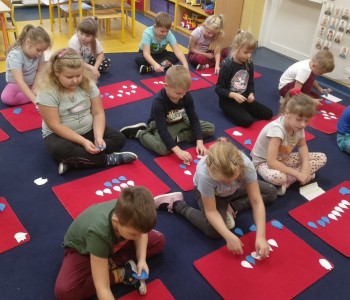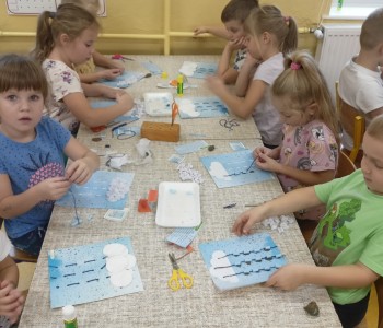 Rysunek deszczu uzupełniły wyciętymi z kolorowego papieru parasolami. Wykorzystując wycięte kropelki deszczu dzieci dodawały i odejmowały na liczmanach oraz układały i kontynuowały układanie rytmów. Przedstawiały również deszcz wykorzystując sznurki, które przeciągały przez dziurki lub rurki ćwicząc w ten sposób sprawność manualną rąk.