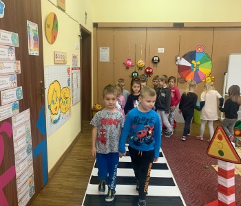 Dzieci utrwaliły znajomość znaków drogowych i numerów alarmowych. Na pobliskim skrzyżowaniu ubrane w kamizelki odblaskowe, uczyły się poprawnego przechodzenia przez jezdnię. W trakcie zajęć wykorzystywano zabawy, prezentacje multimedialne oraz filmy edukacyjne, dzięki którym przedszkolaki poznawały zagrożenia wynikające z niewłaściwego zachowania się na drodze.