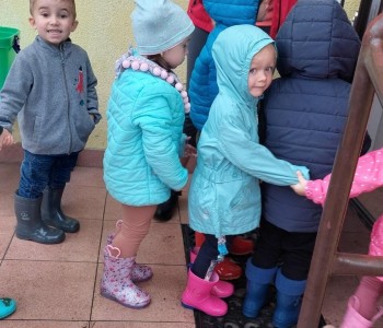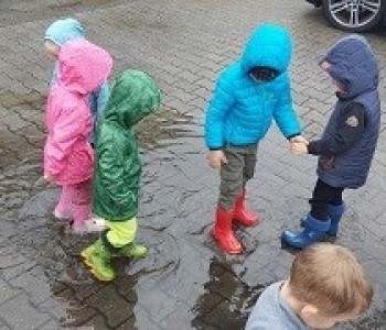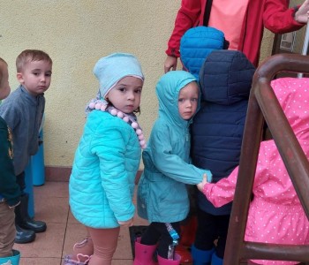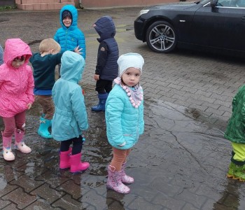 Spacer w mokry dzień z gromadką kolegów i koleżanek z przedszkola to doskonała zabawa: można skakać w kałużach, łapać krople spadające z nieba, spacerować po mokrej trawie.