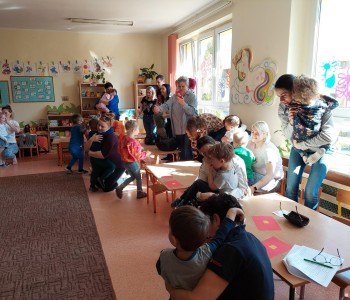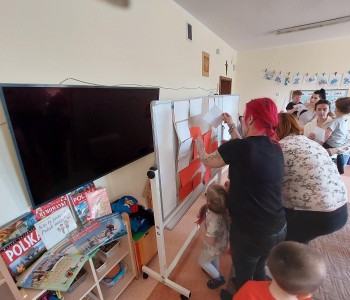 Licznie przybyli członkowie rodzin przedszkolaków brali udział w zabawach ruchowych i dydaktycznych. Na początku dzieci rozwiązywały zagadki językowe, poznały symbole narodowe Polski (przywieszały je na tablicę, opisywały ich wygląd i kolorystykę). Następnie wysłuchały wiersza „Barwy ojczyste” Cz. Janczarskiego i odpowiadały na pytania nauczycielki. Przedszkolaki układały także biało-czerwone rytmy z pomocą najbliższych. Kolejnym zadaniem było odszukanie elementów biało-czerwonych, które po przyklejeniu na tablice utworzyły flagę. Podsumowaniem zajęć było wykonanie grupowych prac plastycznych – „Barwy ojczyste”. Na zakończenie wykonane zostało wspólne zdjęcie ze wszystkimi uczestnikami zajęć.