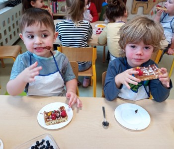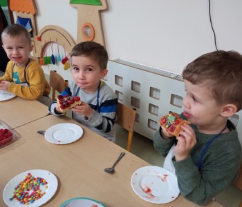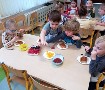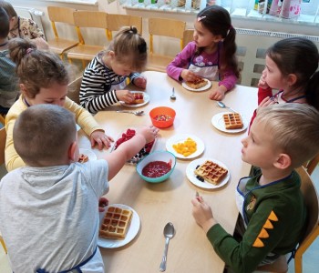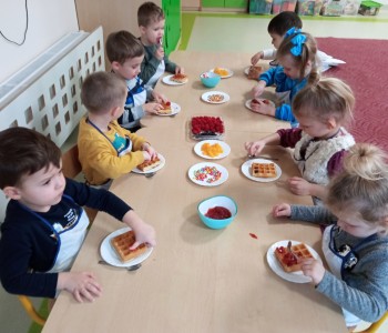 Grupa Wróbelka Elemelka gościła mamę Nikodema, która przeprowadziła z przedszkolakami warsztaty kulinarne. Dzieci poczuły się jak prawdziwi kucharze piekąc gofry. Z dużym zaangażowaniem pomagali wyrobić ciasto i udekorować swoje gofry ulubionymi słodkościami. Było bardzo pysznie i kolorowo. Dziękujemy pani Angelice Strzebińskiej za poświęcony czas i zapraszamy ponownie w progi naszego przedszkola.