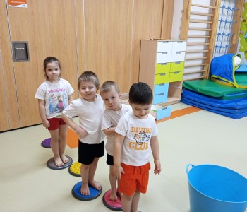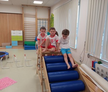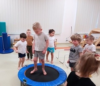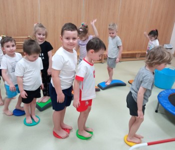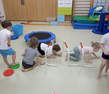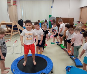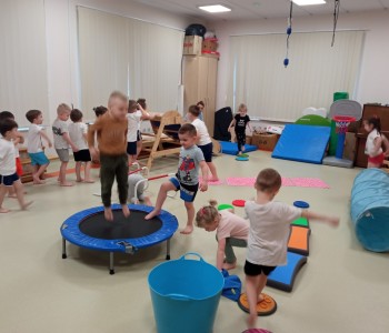Głównym celem ćwiczeń gimnastycznych jest kształtowanie sprawności fizycznej, zwinności, koordynacji wzrokowo – ruchowej a także uświadamianie korzyści dla organizmu wynikających z ćwiczeń i zabaw ruchowych. Grupa Wróbelka Elemelka miała za zadanie pokonać tor przeszkód, dzieci przechodziły po zróżnicowanych ścieżkach, skakały na trampolinie a także doskonaliły umiejętność planowania motorycznego.