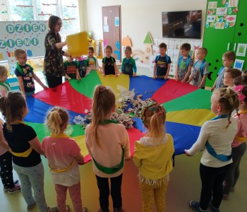 W tym ważnym dniu powinniśmy wszyscy, choć przez chwilę pomyśleć o planecie, na której żyjemy i o otaczającej nas przyrodzie. Podczas aktywności dzieci bawiły się globusem, oglądały teatrzyk kukiełkowy, brały udział w zabawach ruchowych i dydaktycznych utrwalających wiedzę o segregacji odpadów. Na koniec wykonały wspólnie eko-drzewo.